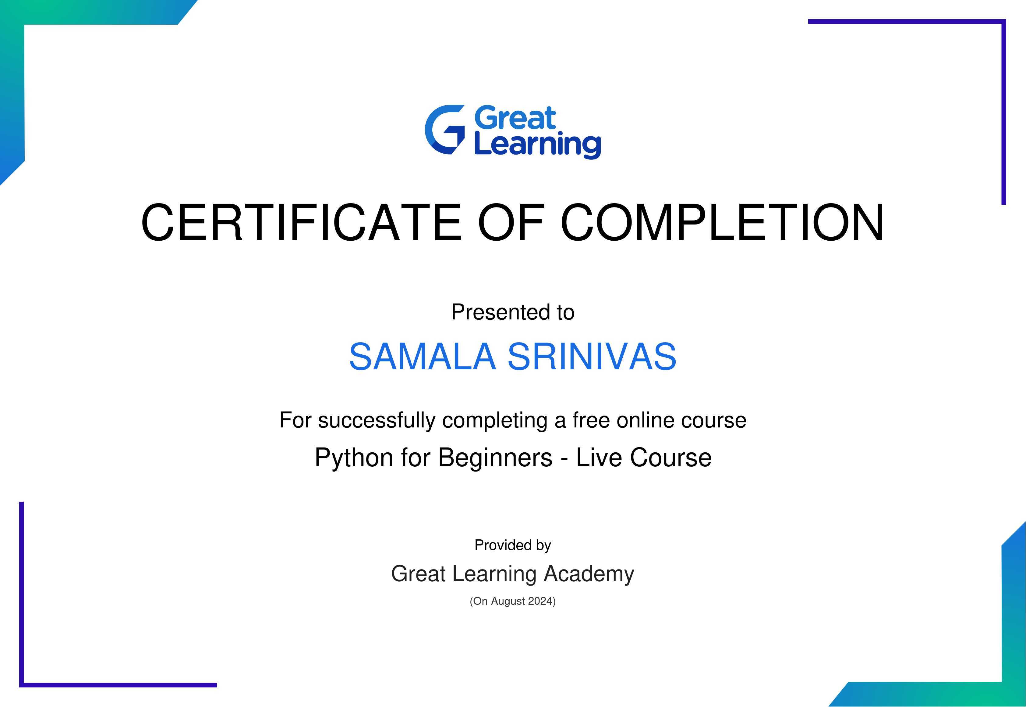 The certificate above verifies that Samala Srinivas has successfully completed the course Python for Beginners - Live Course