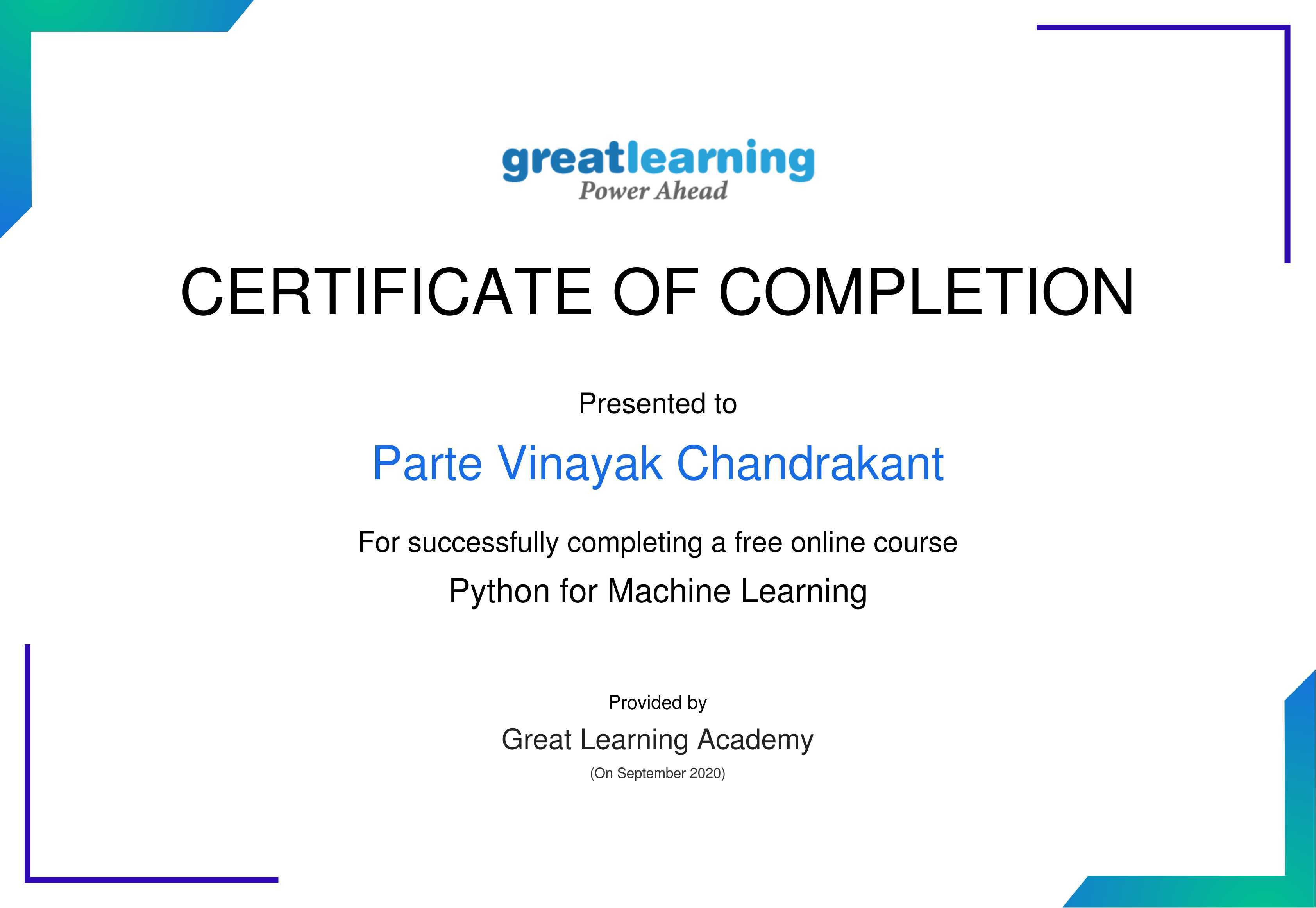 The certificate above verifies that Parte Vinayak Chandrakant has successfully completed the course Python for Machine Learning