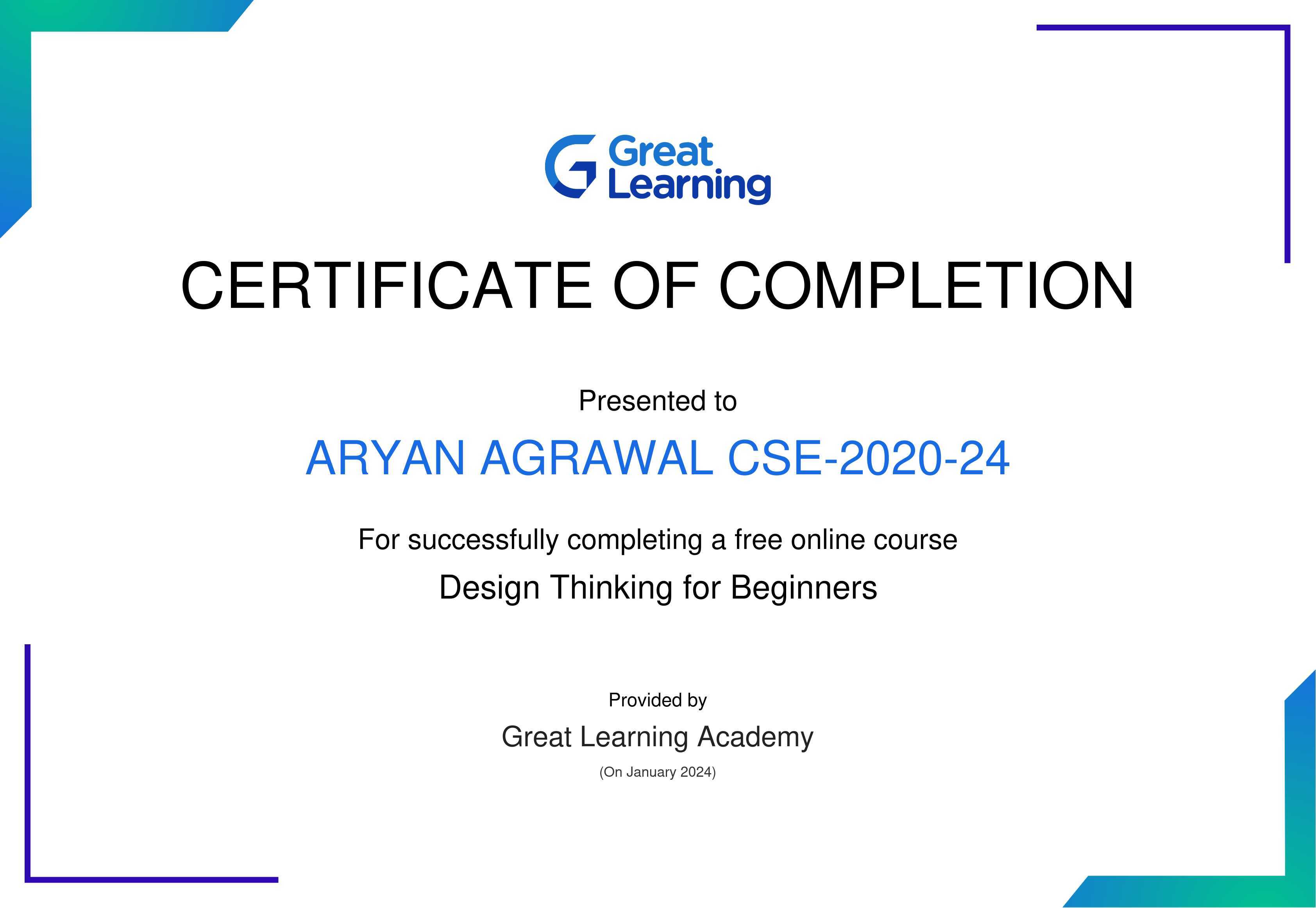The certificate above verifies that Aryan Agrawal Cse 2020 24 has successfully completed the course Design Thinking for Beginners
