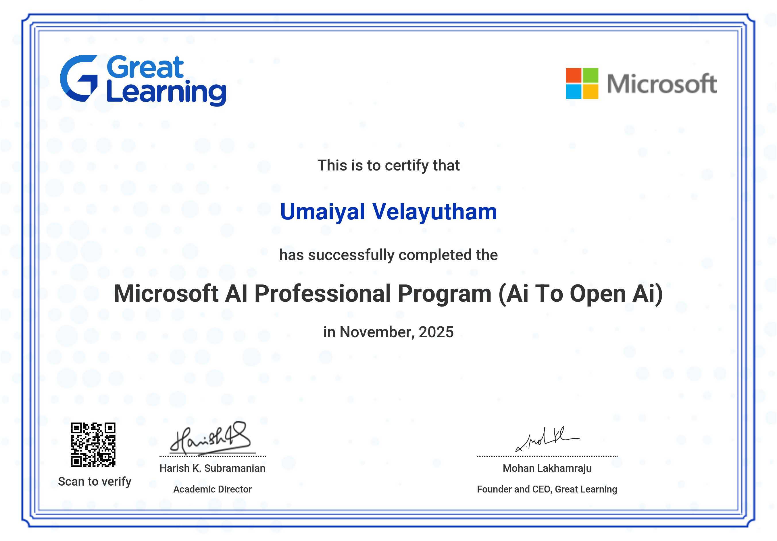 The certificate below verifies that UMAIYAL VELAYUTHAM has completed the MICROSOFT AI PROFESSIONAL PROGRAM (AI TO OPEN AI)