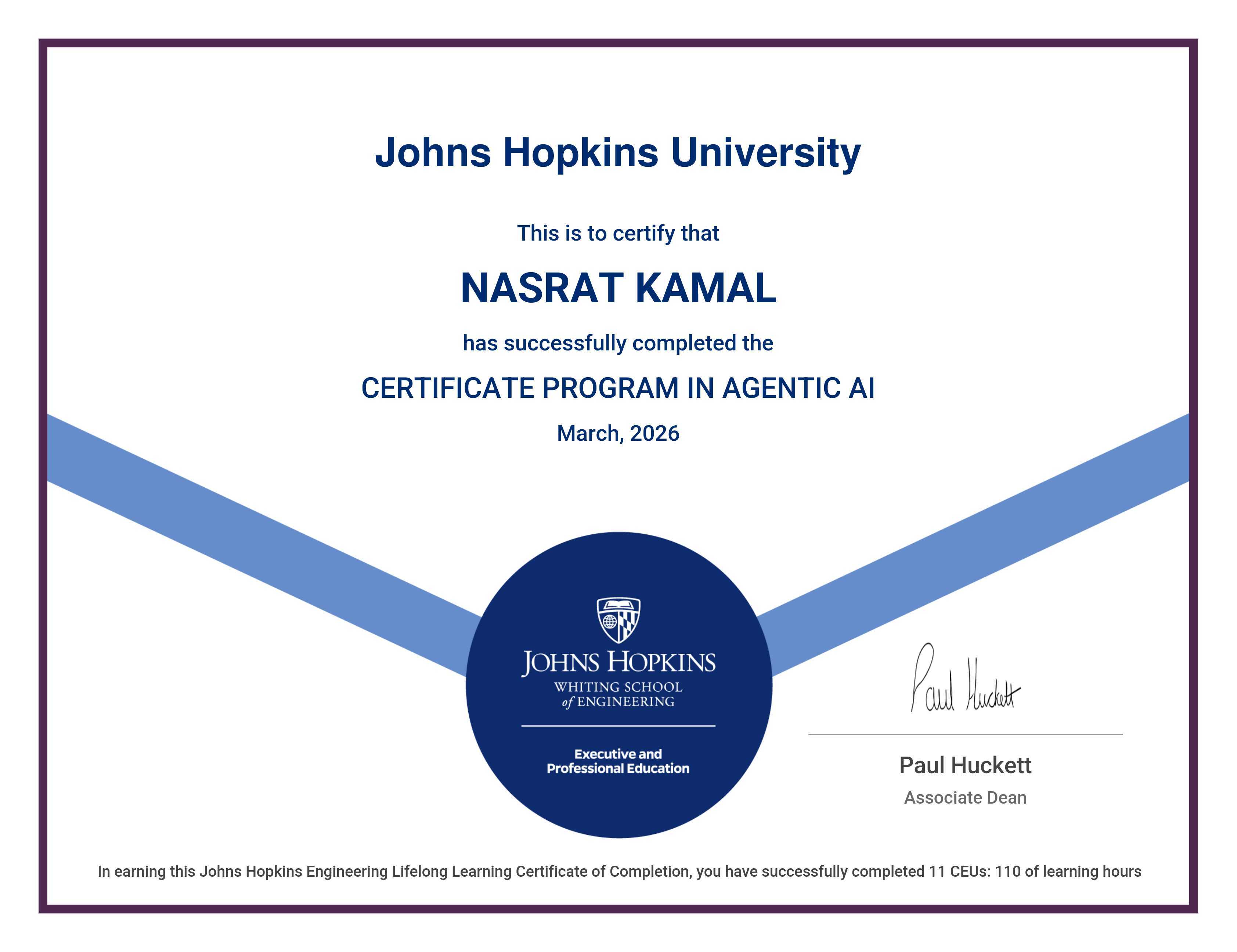 The certificate below verifies that NASRAT KAMAL has completed the CERTIFICATE PROGRAM IN AGENTIC AI