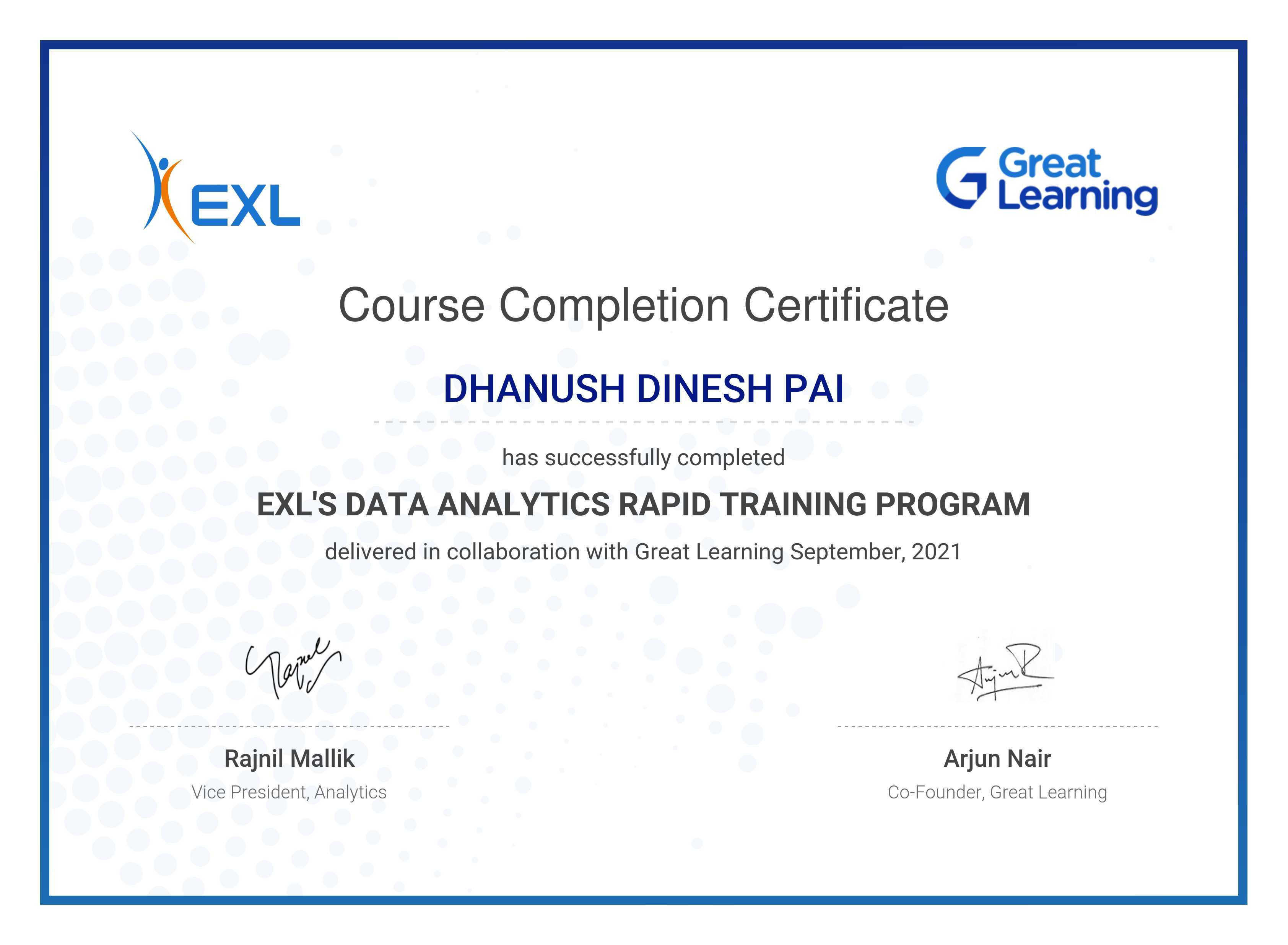 The certificate below verifies that DHANUSH DINESH PAI has completed the EXL'S DATA ANALYTICS RAPID TRAINING PROGRAM