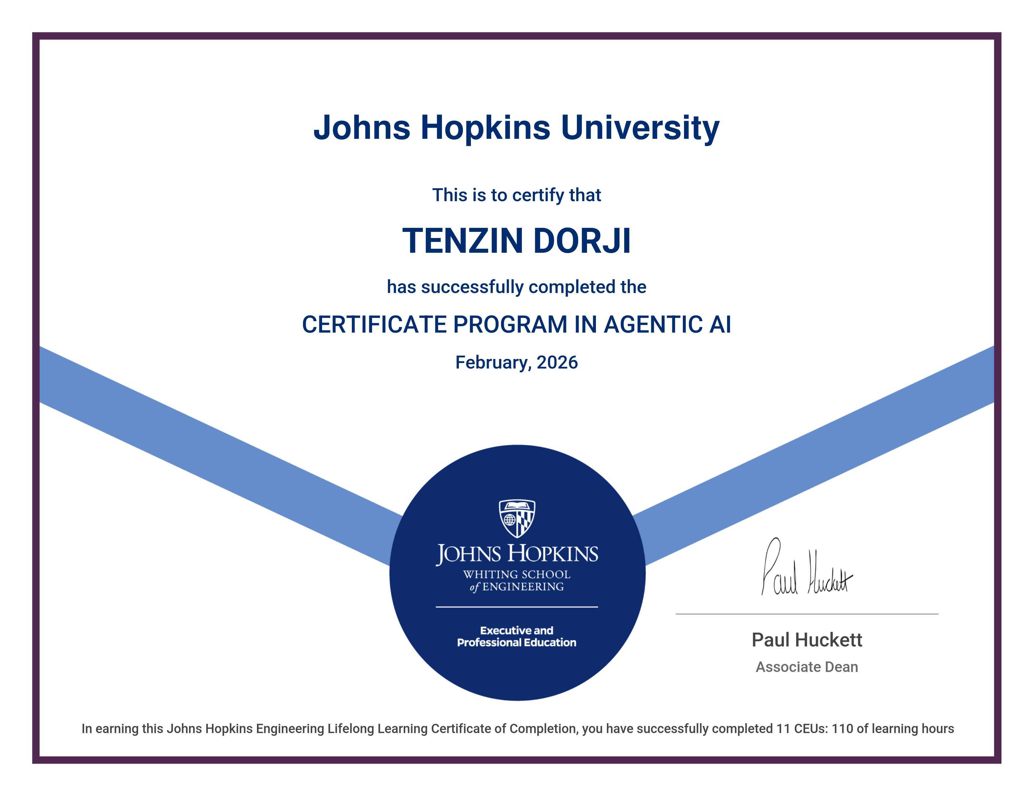 The certificate below verifies that TENZIN DORJI has completed the CERTIFICATE PROGRAM IN AGENTIC AI
