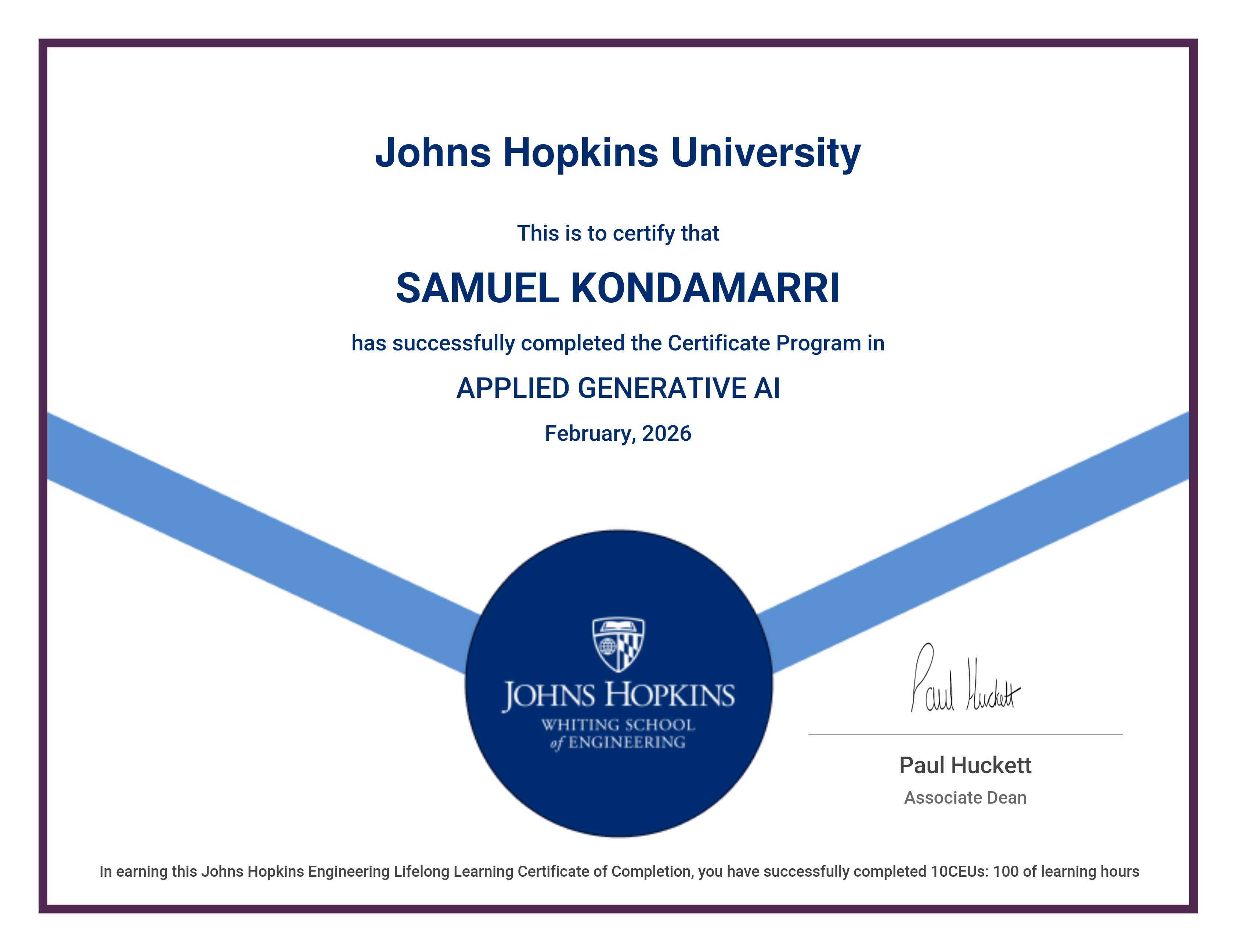 The certificate below verifies that SAMUEL KONDAMARRI has completed the APPLIED GENERATIVE AI