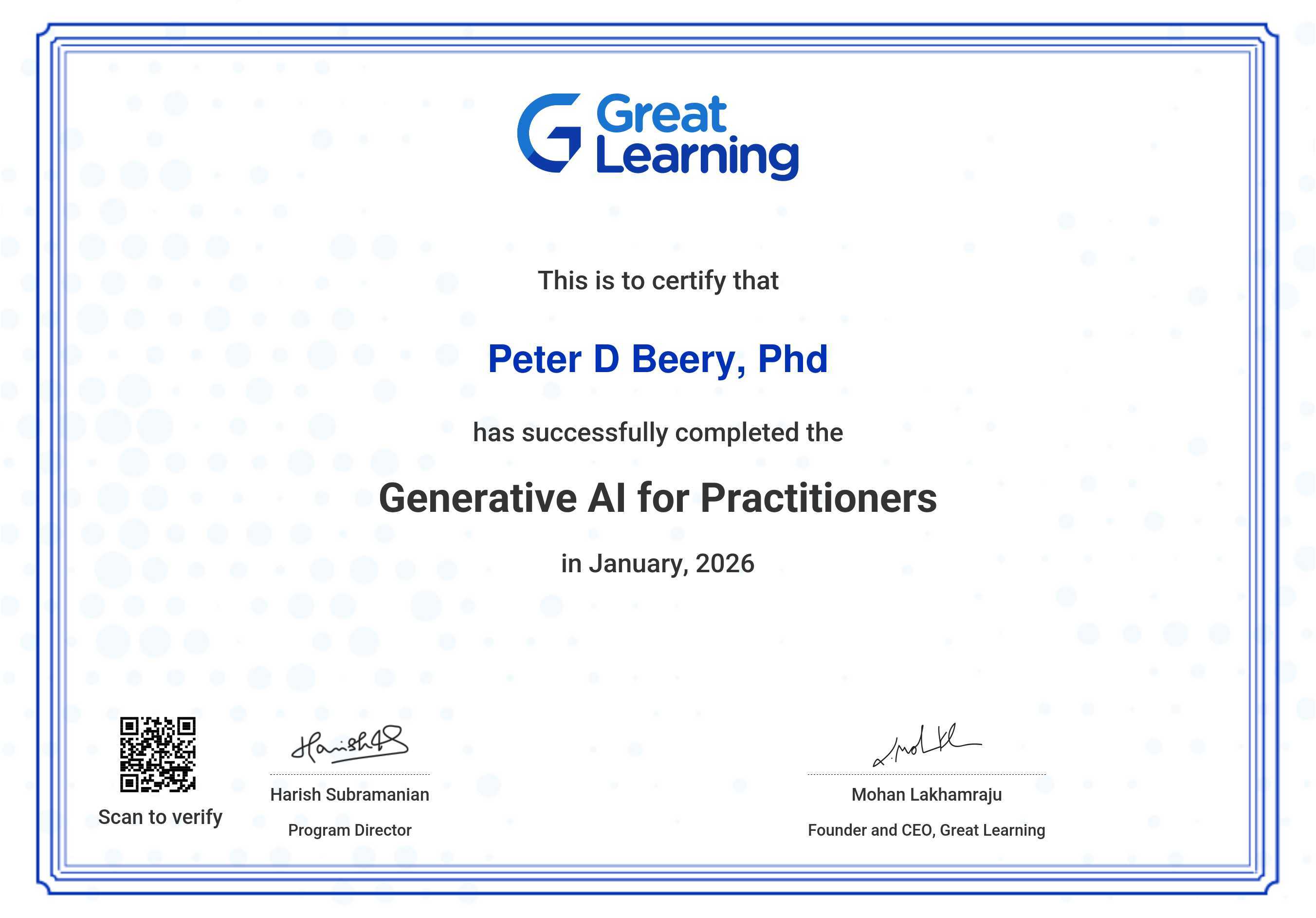 The certificate below verifies that PETER D BEERY, PHD has completed the GENERATIVE AI for PRACTITIONERS