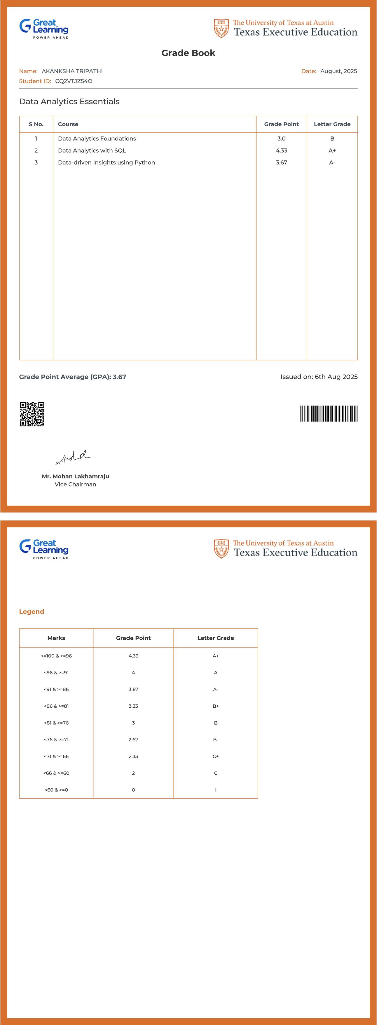 The grade sheet below verifies that AKANKSHA TRIPATHI has completed the DATA ANALYTICS ESSENTIALS