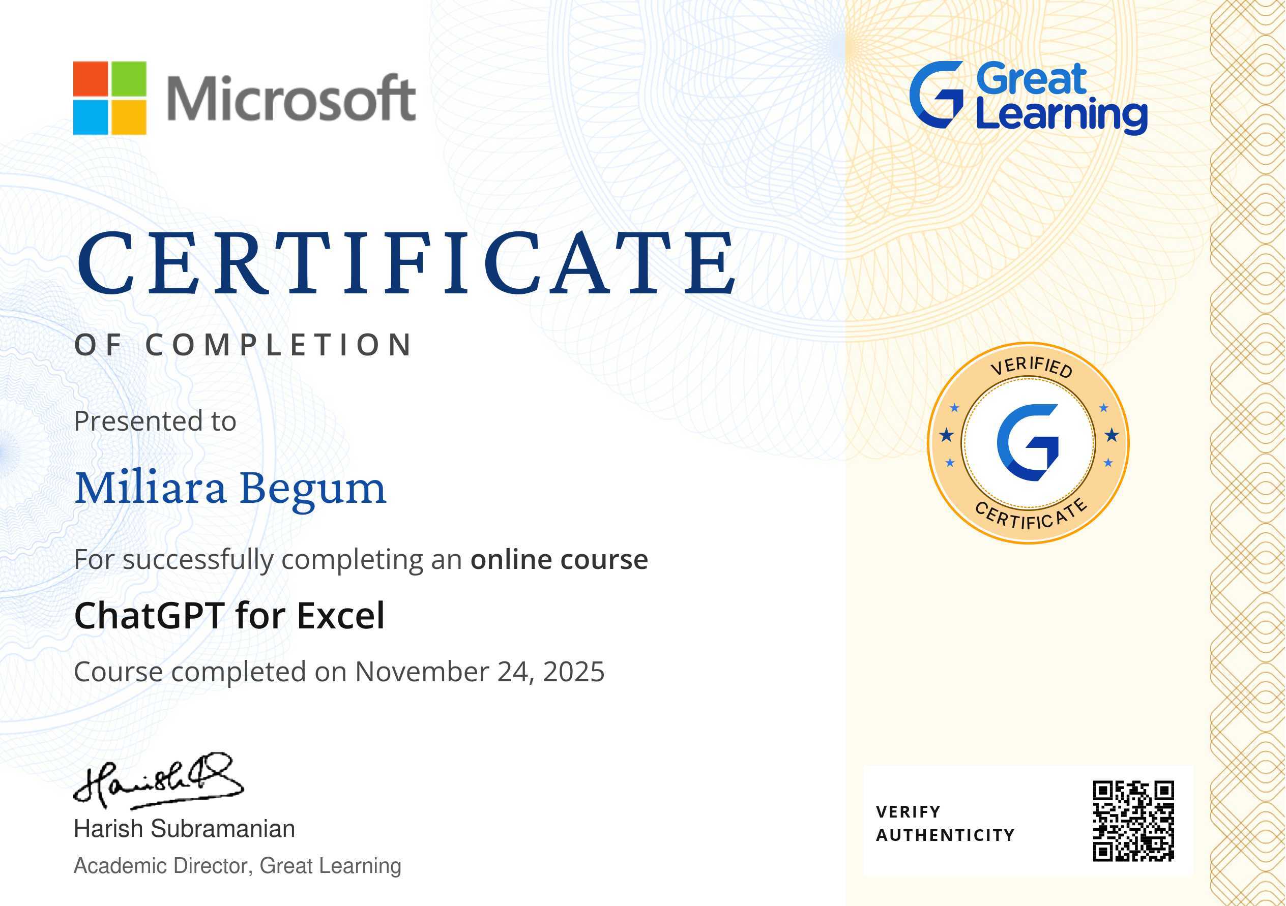 The certificate above verifies that Miliara Begum has successfully completed the course ChatGPT for Excel