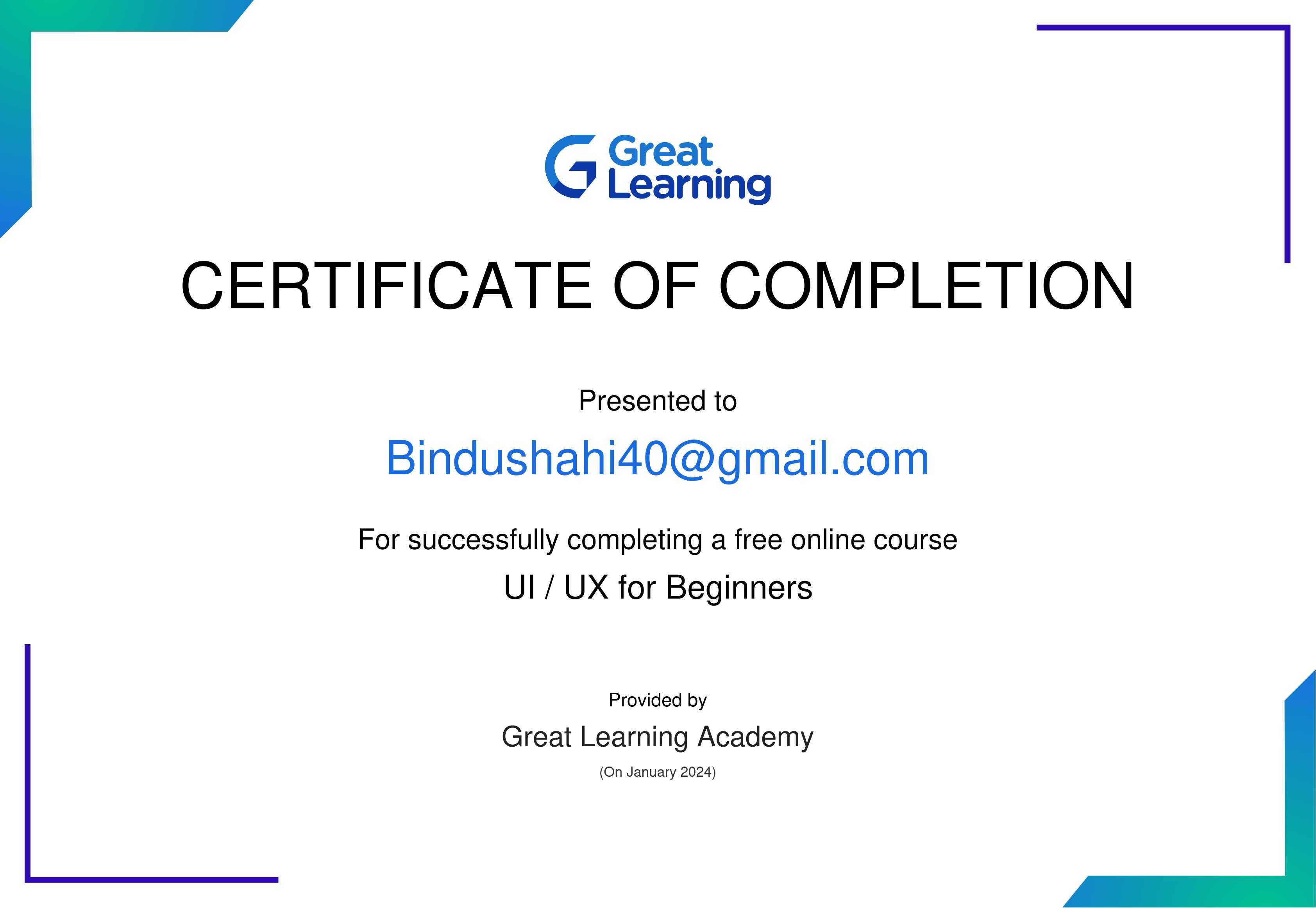 The certificate above verifies that Bindu Shahi has successfully completed the course UI / UX for Beginners