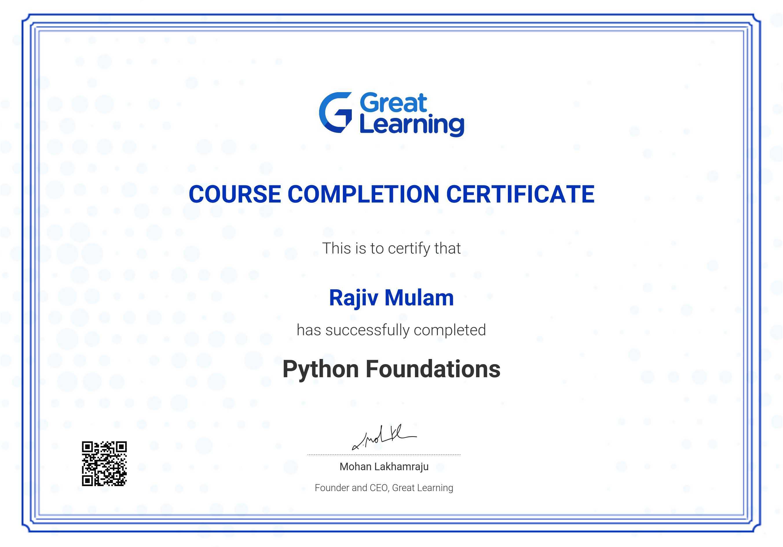 The certificate below verifies that Rajiv Mulam has completed the Python Foundations course