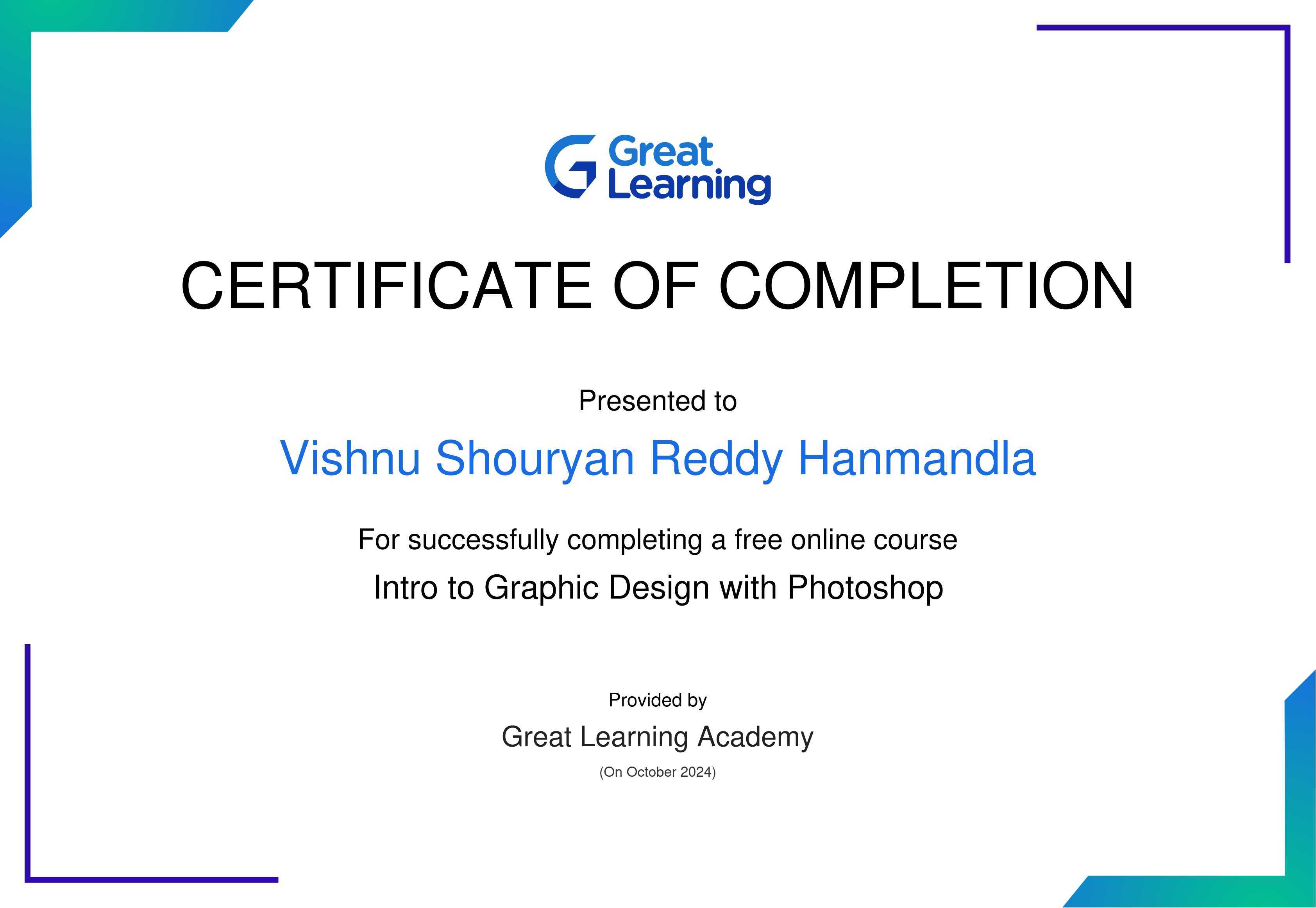 The certificate above verifies that Vishnu Shouryan Reddy Hanmandla has successfully completed the course Intro to Graphic Design with Photoshop