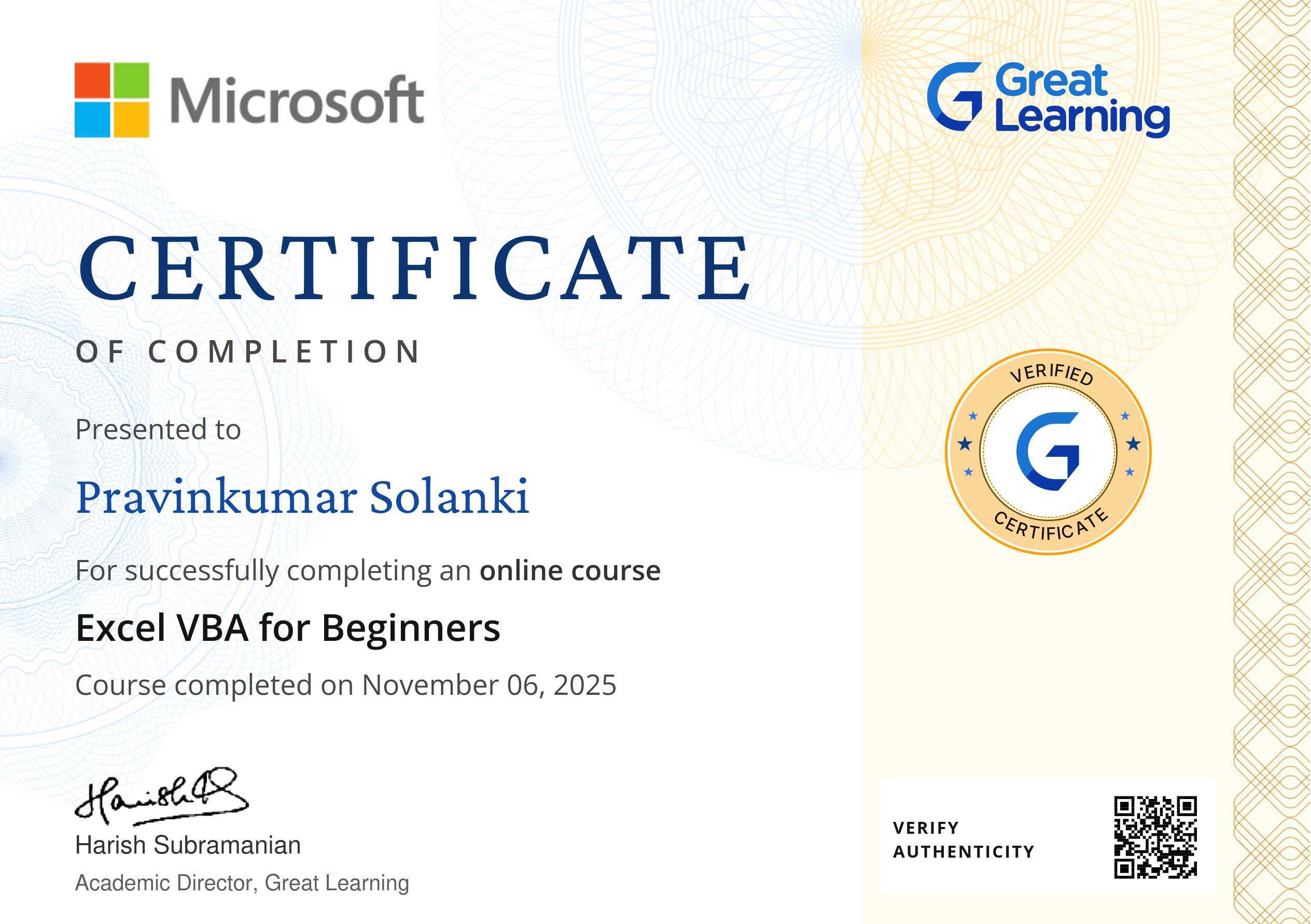 The certificate above verifies that Pravinkumar Solanki has successfully completed the course Excel VBA for Beginners