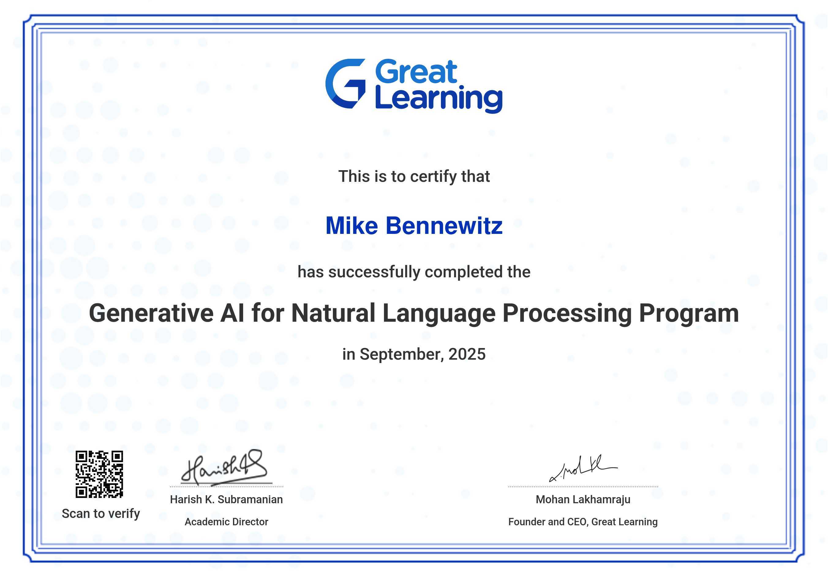 The certificate below verifies that MIKE BENNEWITZ has completed the GENERATIVE AI for NATURAL LANGUAGE PROCESSING PROGRAM