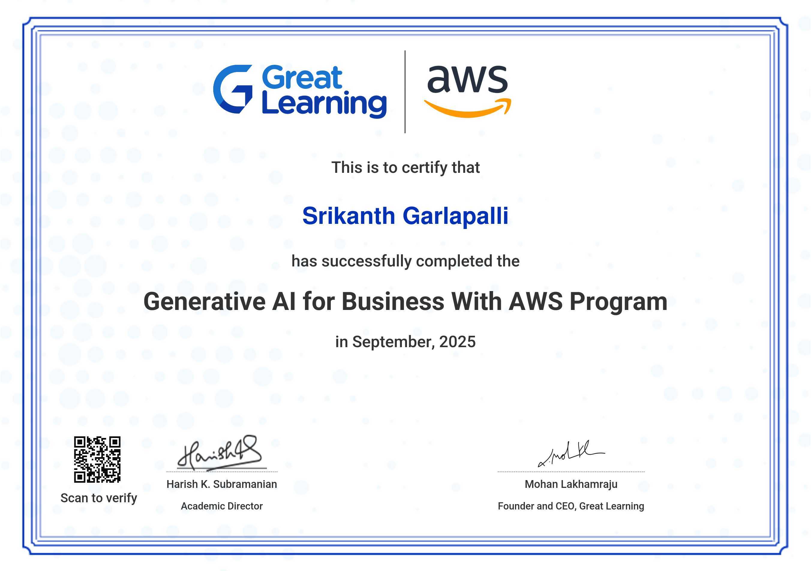 The certificate below verifies that SRIKANTH GARLAPALLI has completed the GENERATIVE AI for BUSINESS WITH AWS PROGRAM