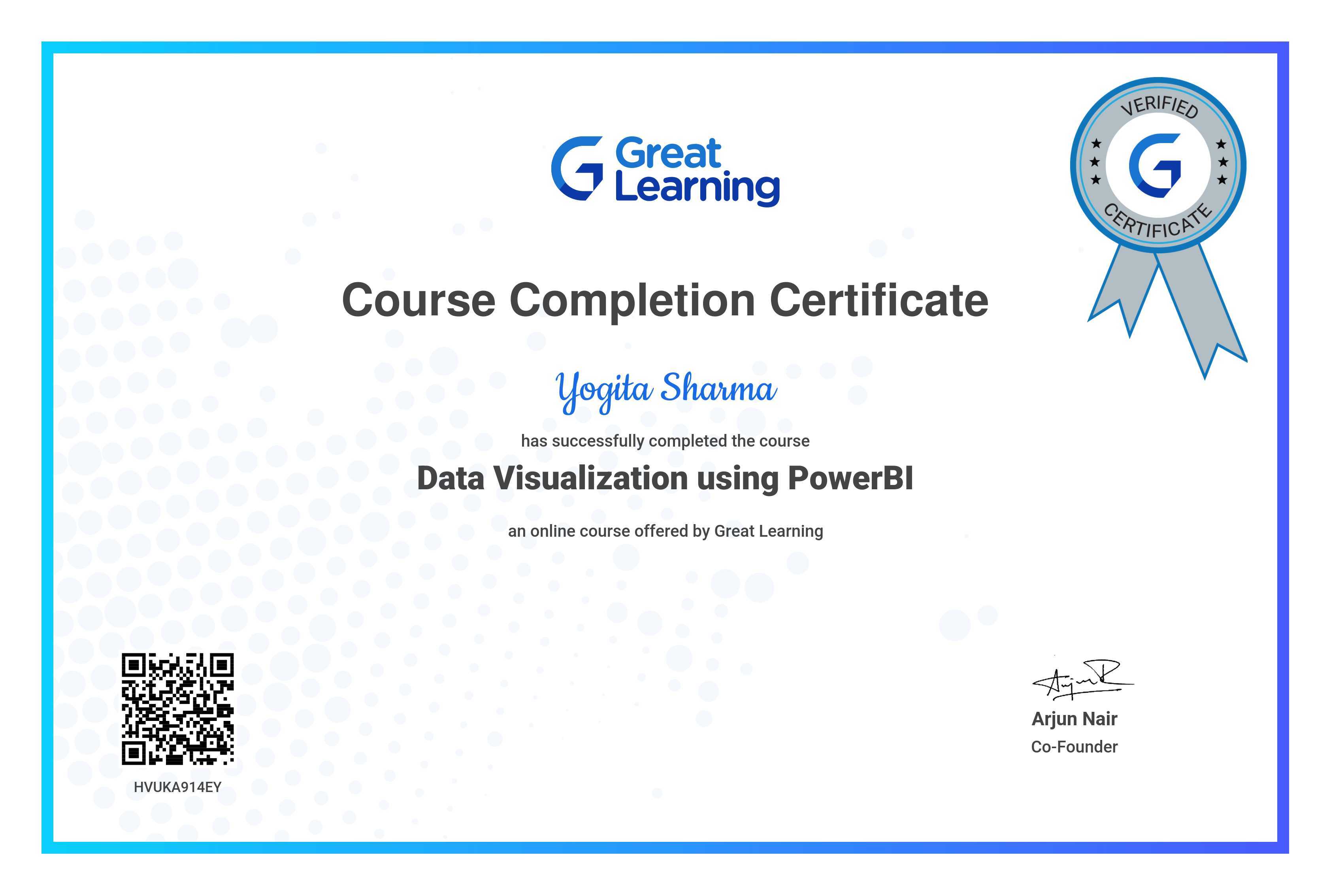 The certificate above verifies that Yogita Sharma has successfully completed the course Data Visualization using PowerBI