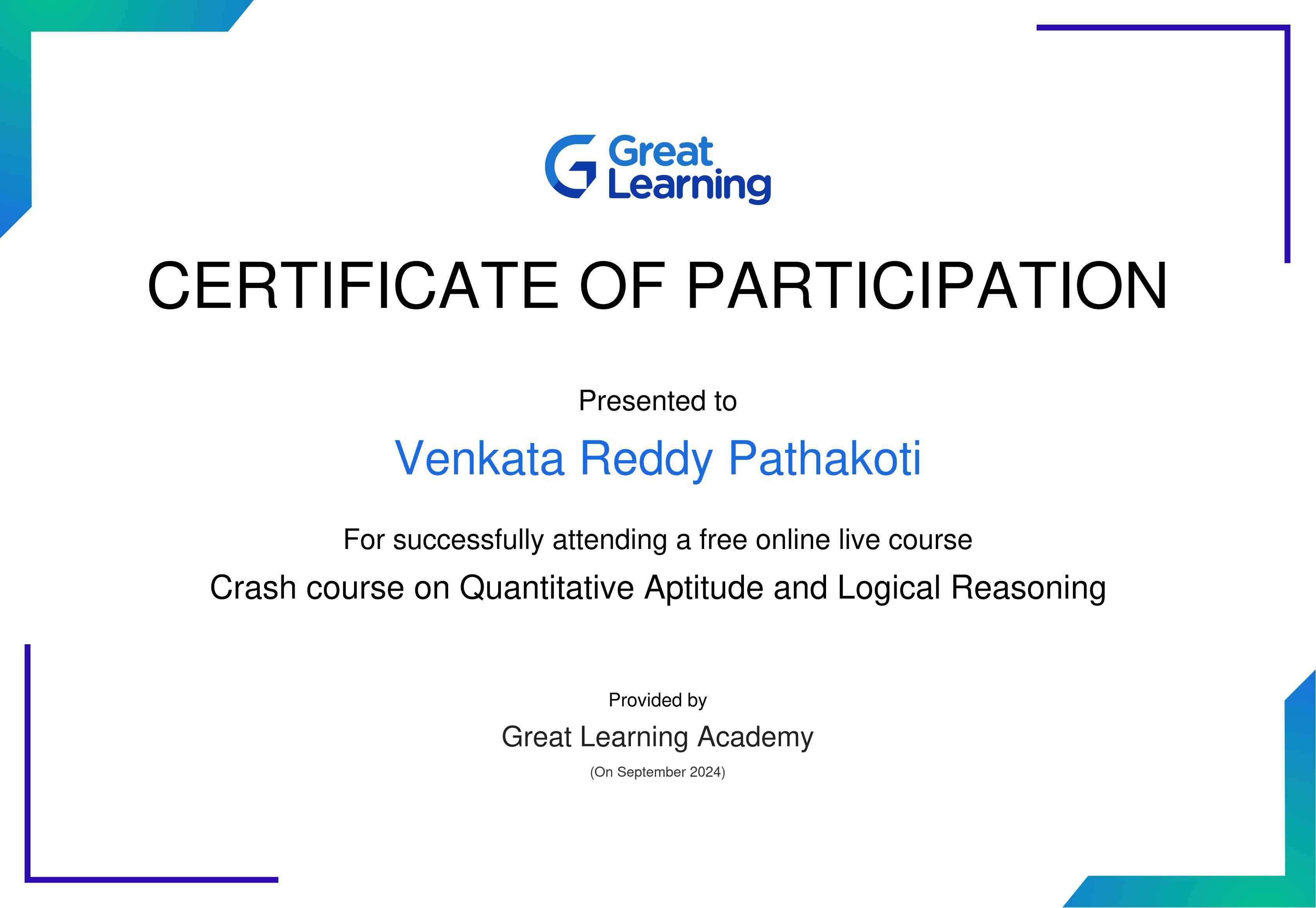 The certificate above verifies that Venkata Reddy Pathakoti has successfully completed the course Crash course on Quantitative Aptitude and Logical Reasoning