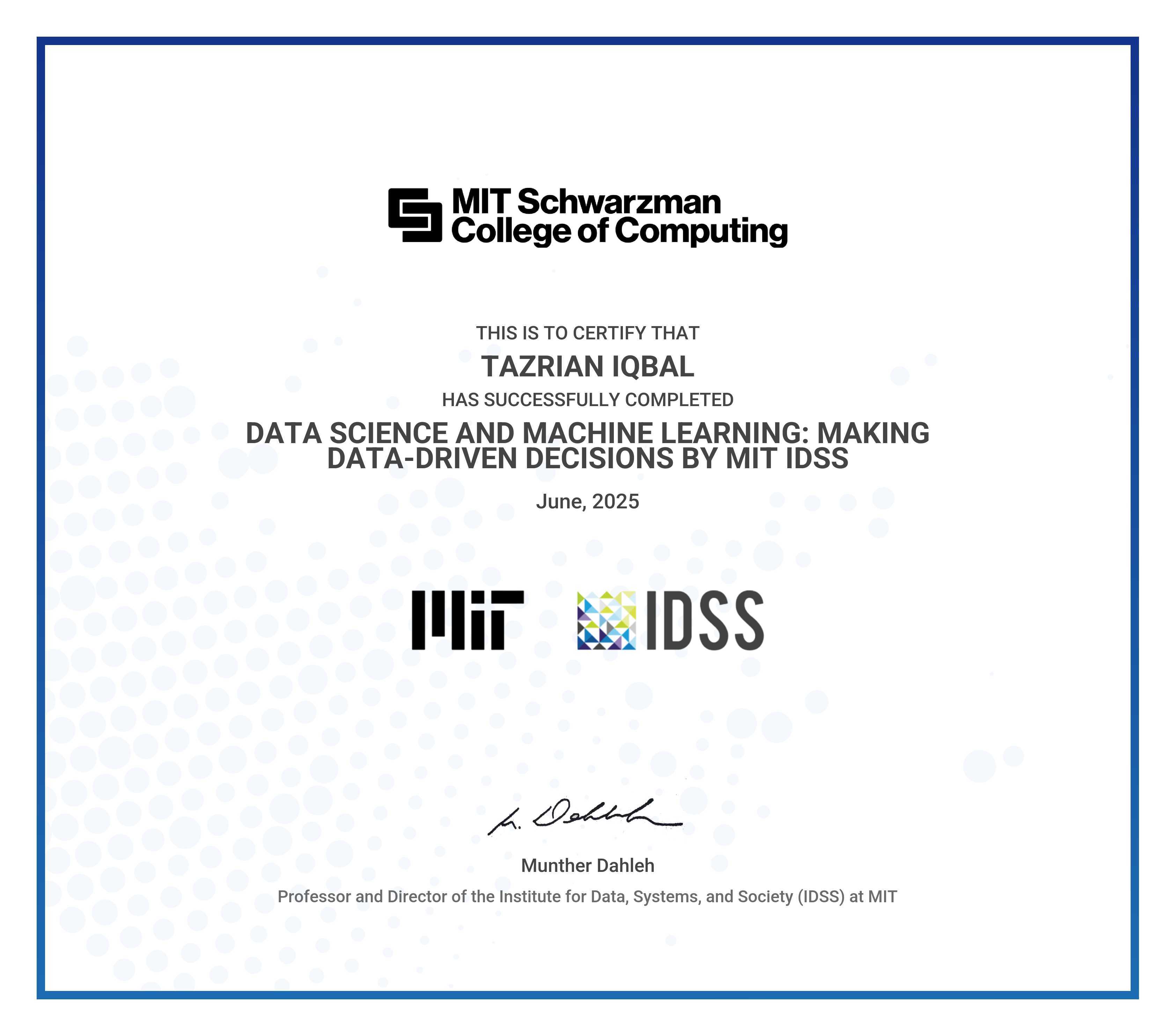 The certificate below verifies that TAZRIAN IQBAL has completed the DATA SCIENCE AND MACHINE LEARNING: MAKING DATA-DRIVEN DECISIONS BY MIT IDSS
