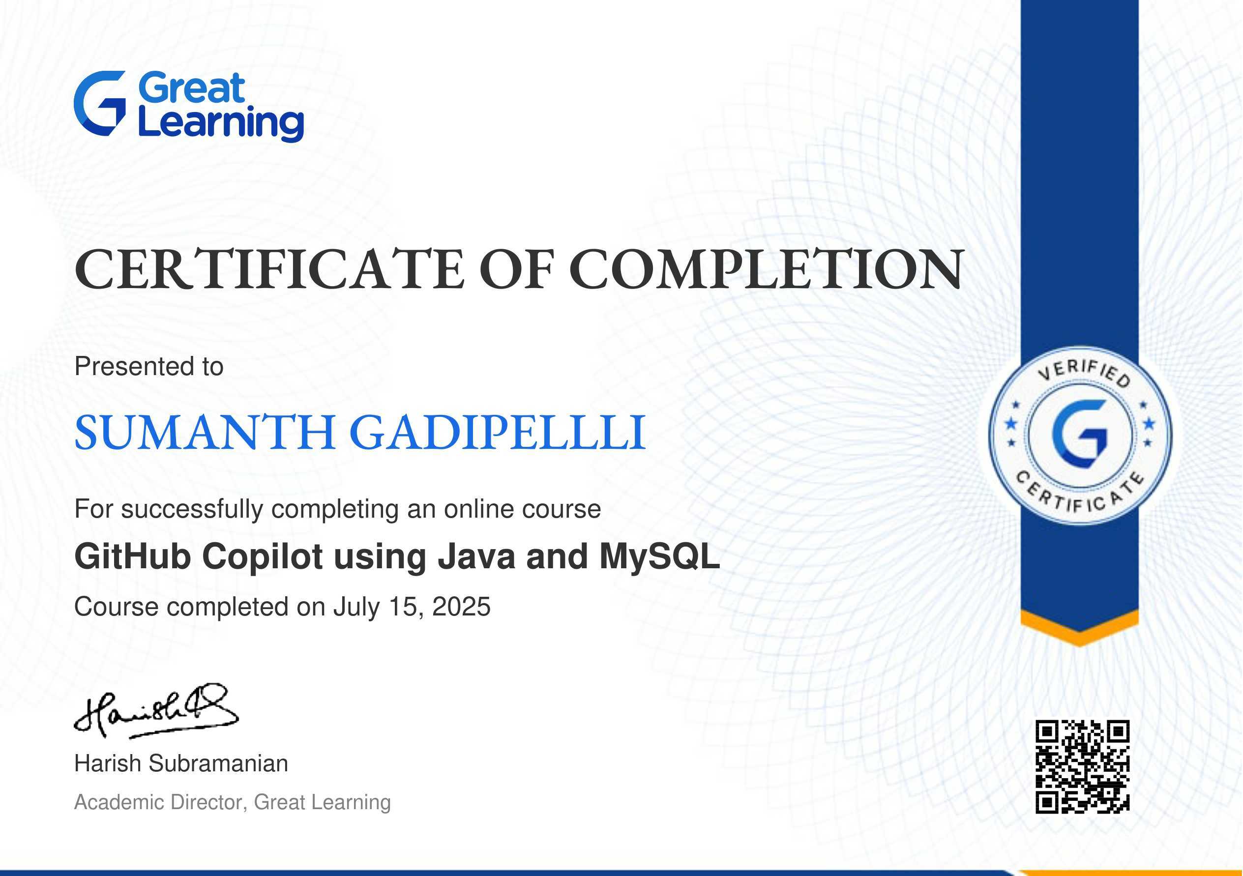 The certificate above verifies that Sumanth Gadipellli has successfully completed the course GitHub Copilot Using Java and MySQL