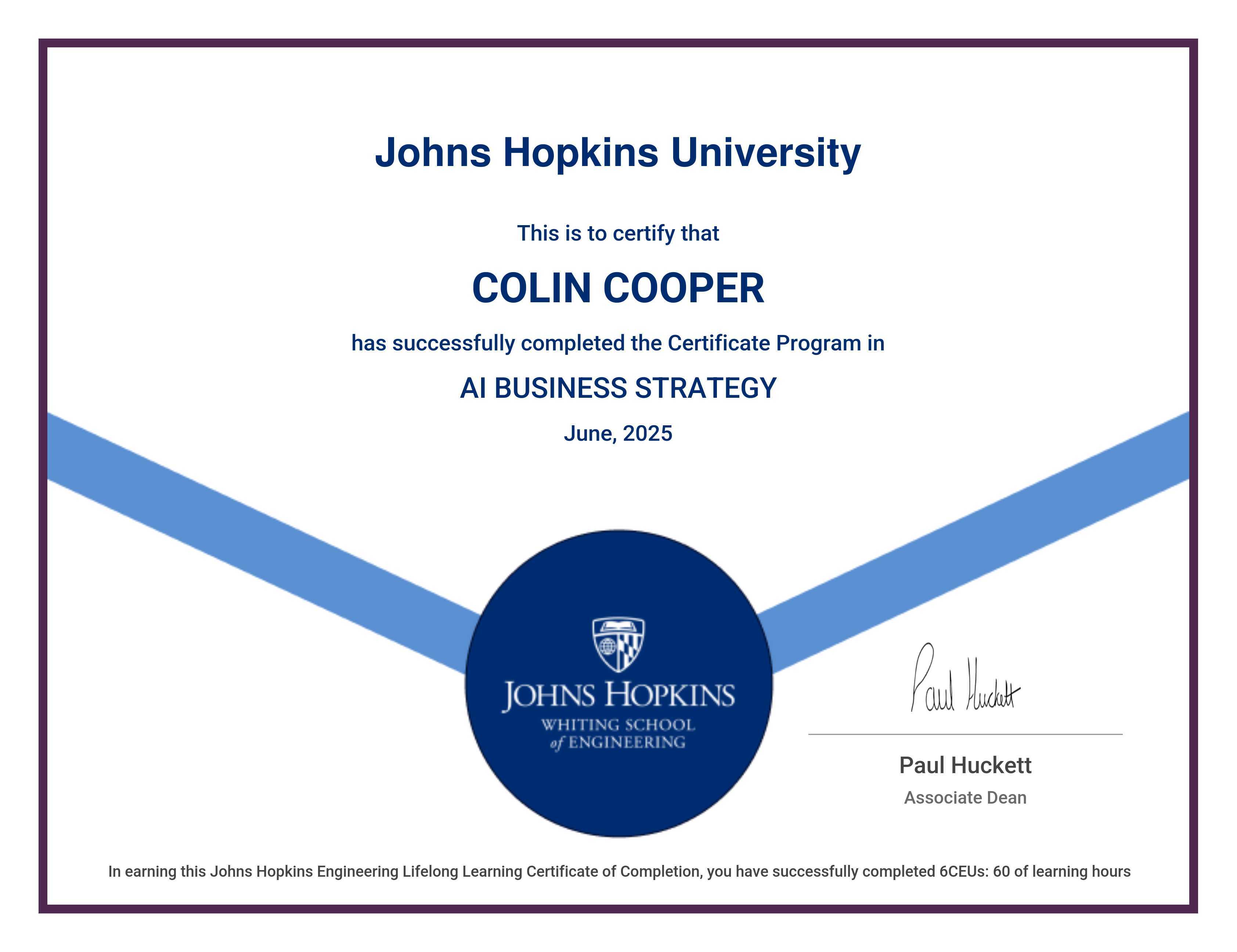 The certificate below verifies that COLIN COOPER has completed the AI BUSINESS STRATEGY