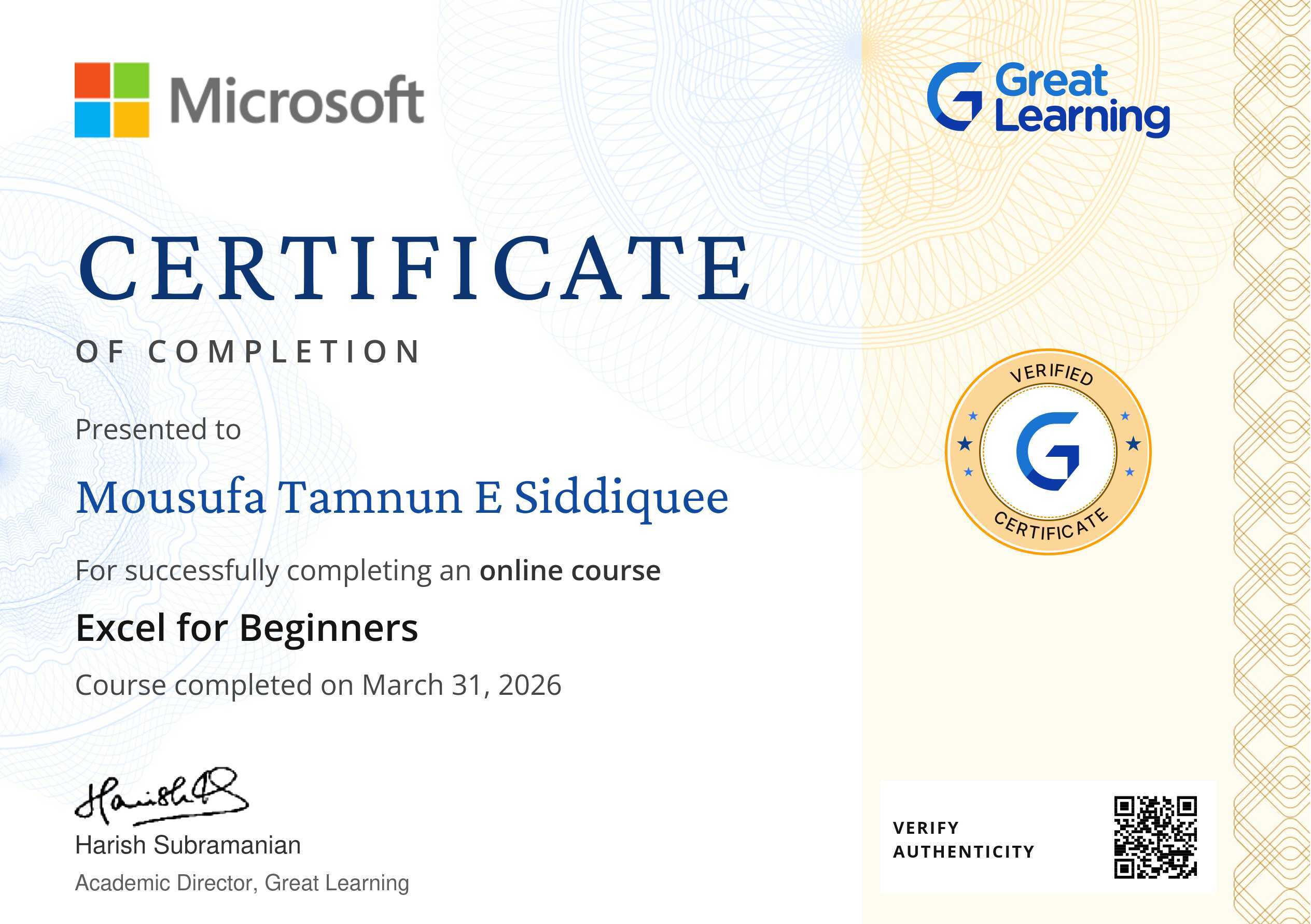 The certificate above verifies that Mousufa Tamnun E Siddiquee has successfully completed the course Excel for Beginners