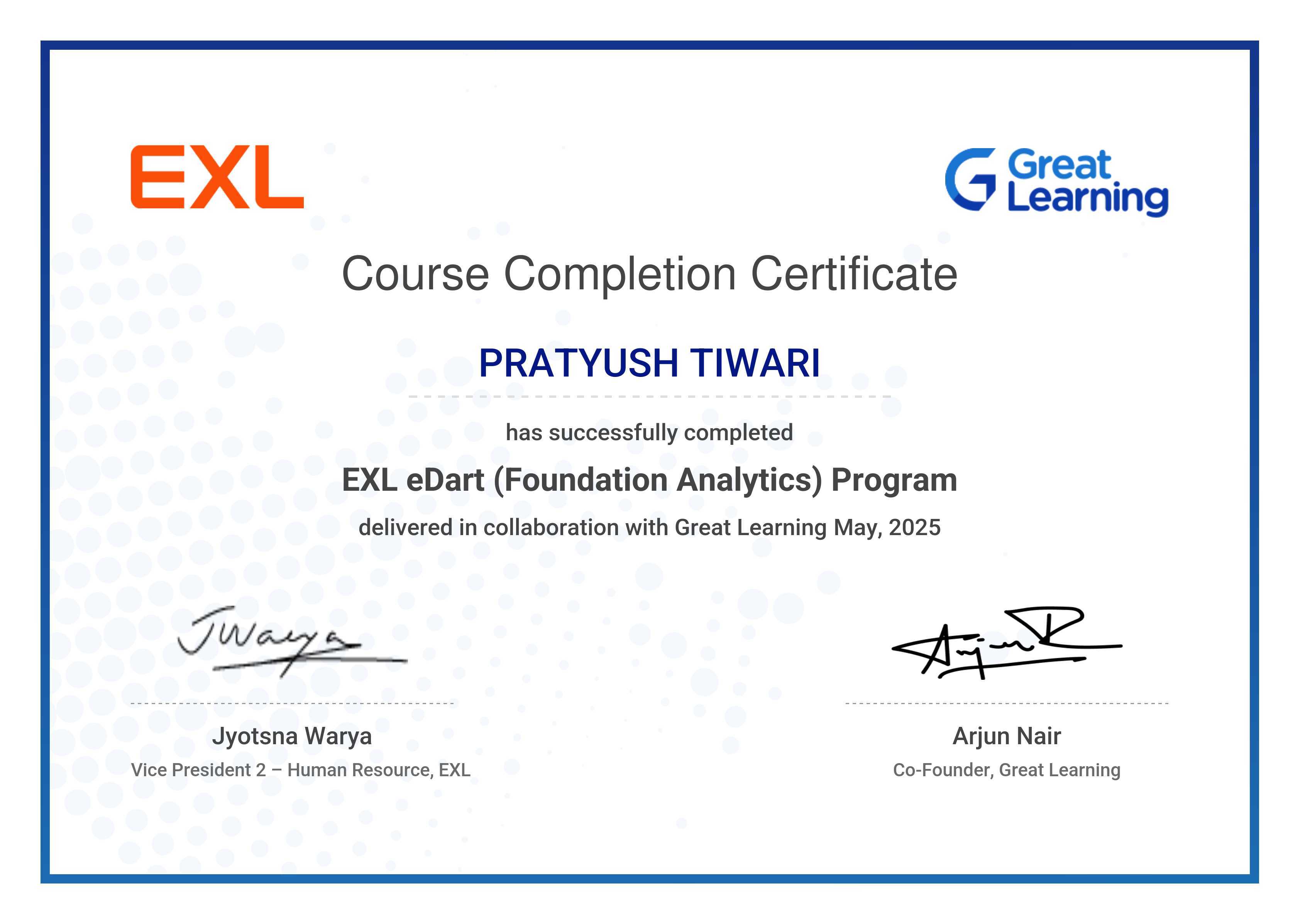 The certificate below verifies that PRATYUSH TIWARI has completed the EXL - eDART (Foundation Analytics) Program