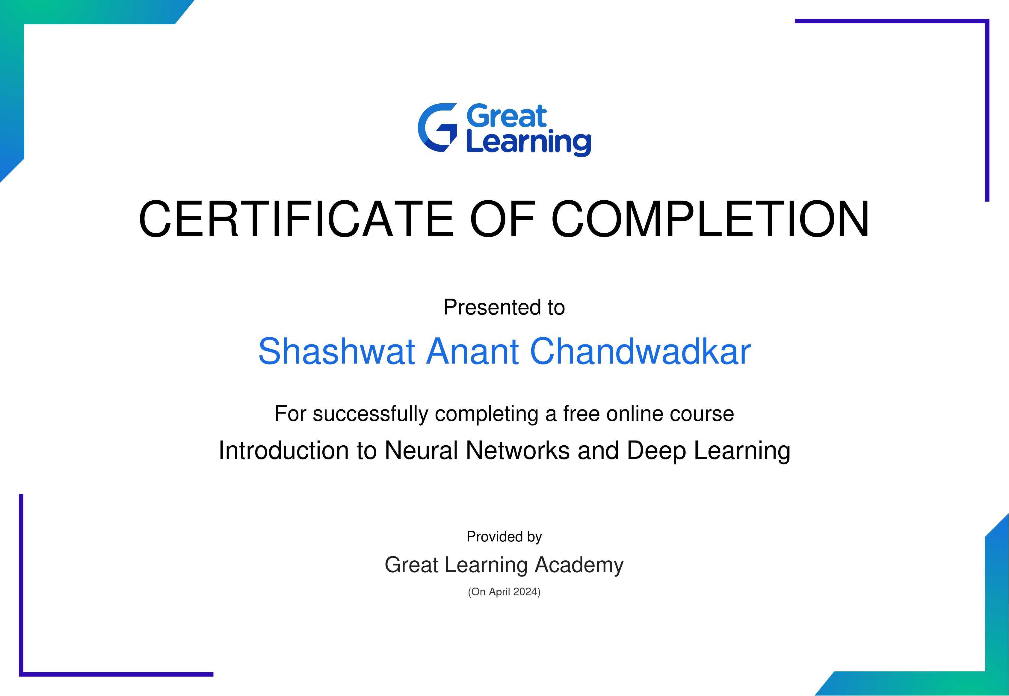 The certificate above verifies that Shashwat Anant Chandwadkar has successfully completed the course Introduction to Neural Networks and Deep Learning