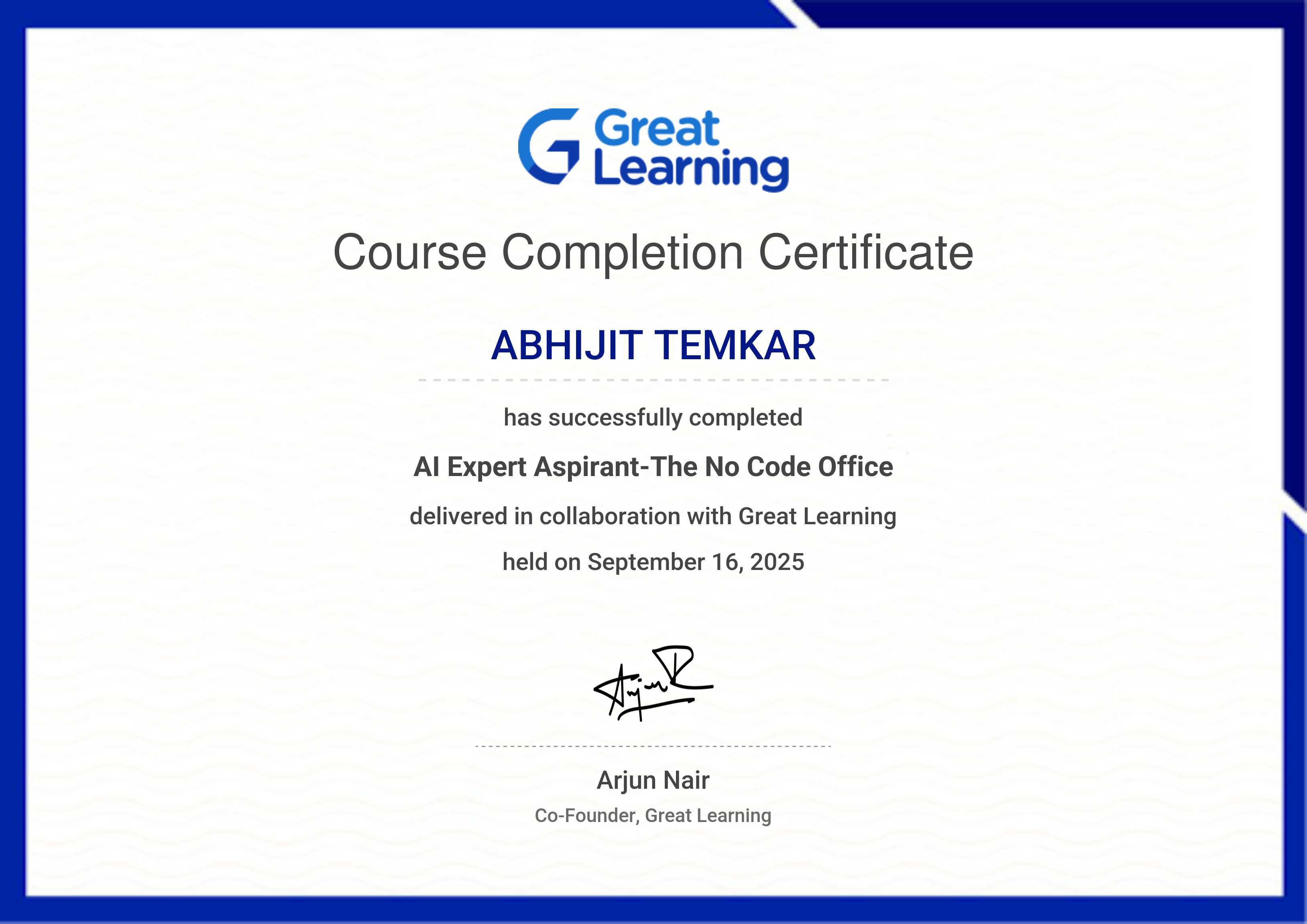 The certificate below verifies that ABHIJIT TEMKAR has completed the AI Expert Aspirant-The No Code Office