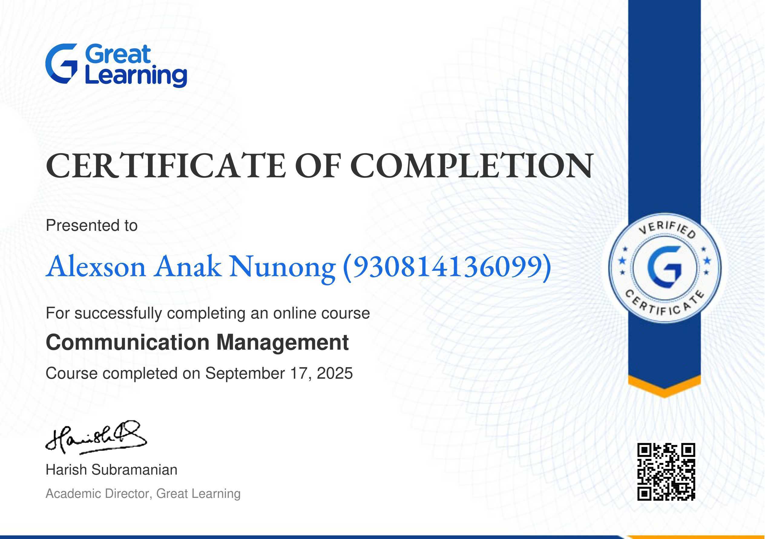 The certificate above verifies that Alexson Anak Nunong has successfully completed the course Communication Management