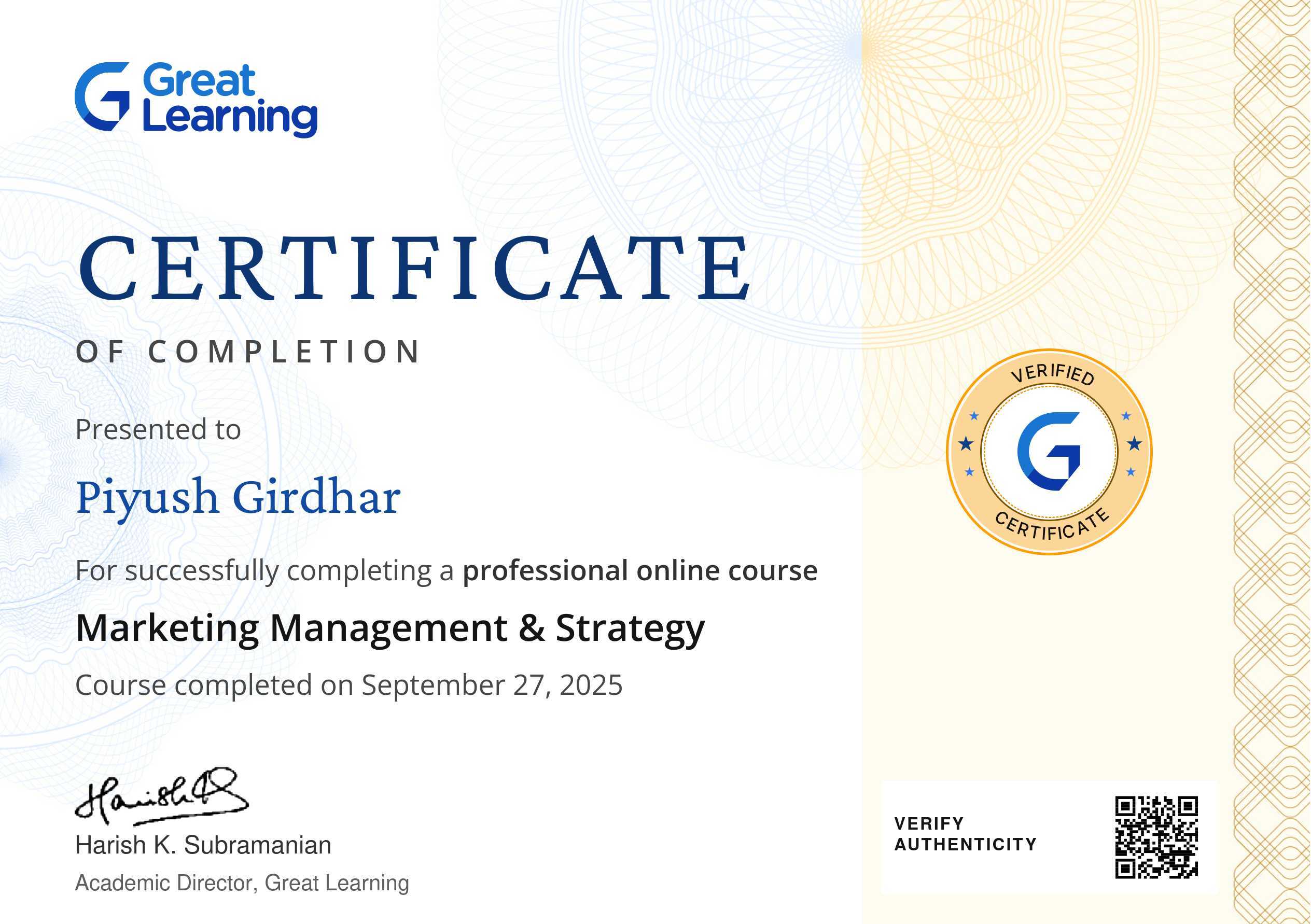 The certificate above verifies that Piyush Girdhar has successfully completed the course Marketing Management & Strategy