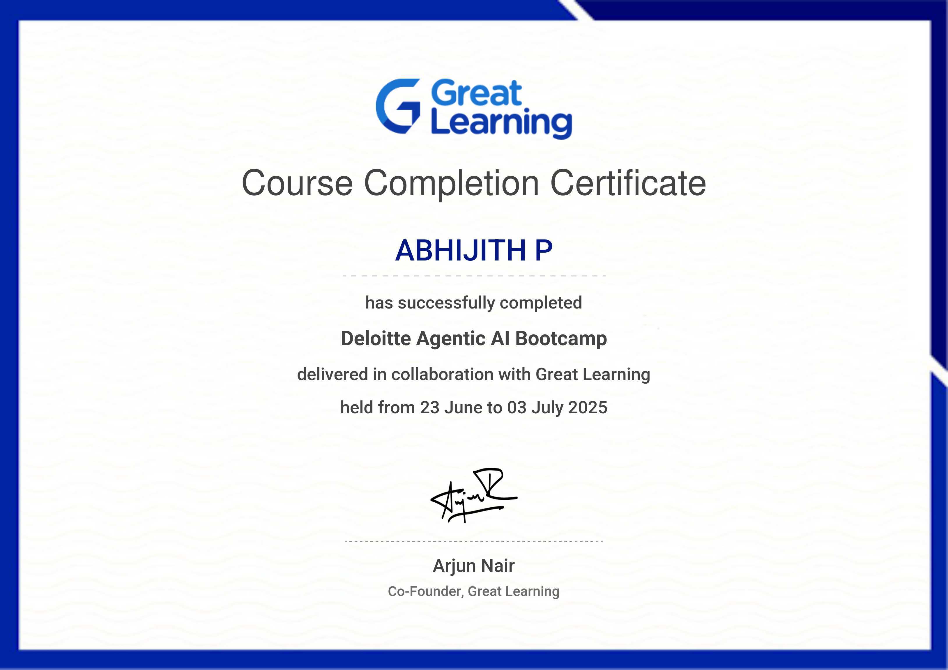 The certificate below verifies that ABHIJITH P has completed the Deloitte Agentic AI Bootcamp