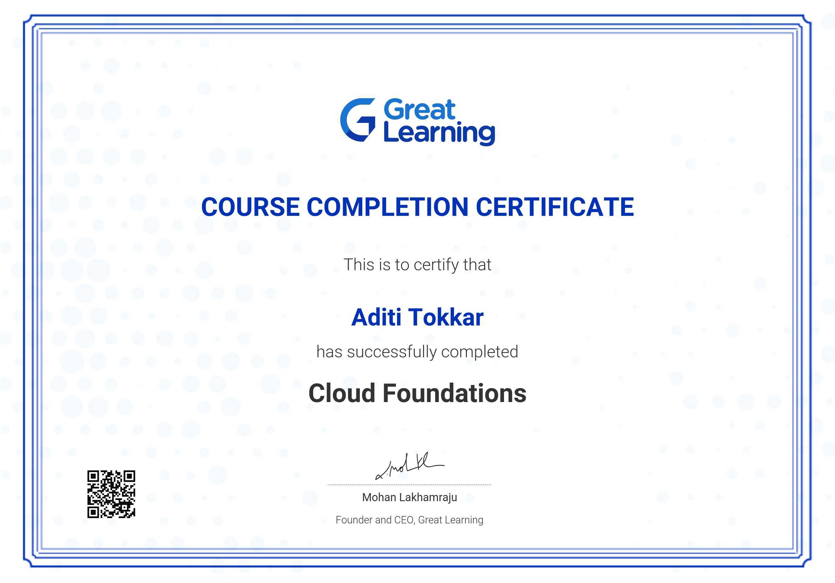 The certificate below verifies that Aditi Tokkar has completed the Cloud Foundations course