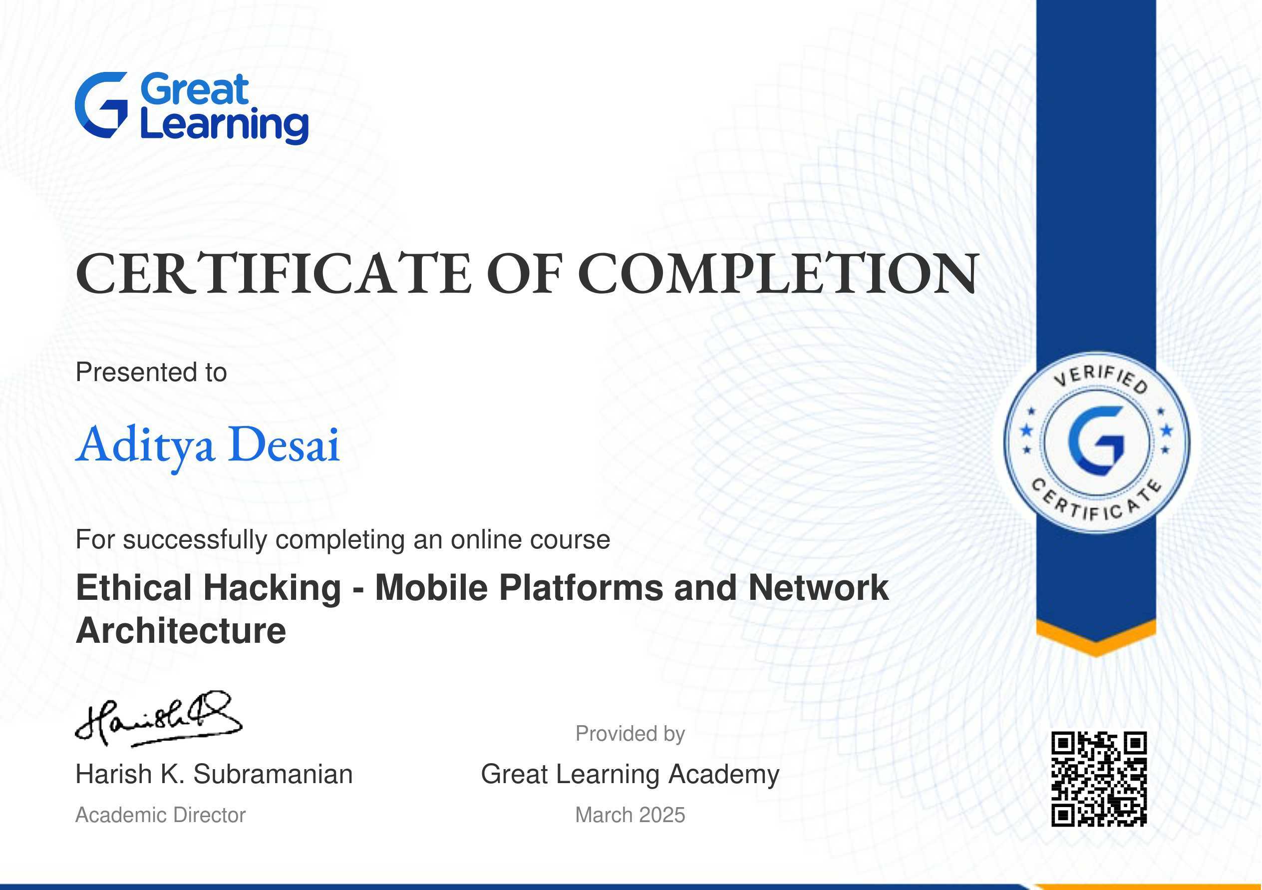 The certificate above verifies that Aditya Desai has successfully completed the course Ethical Hacking - Mobile Platforms and Network Architecture