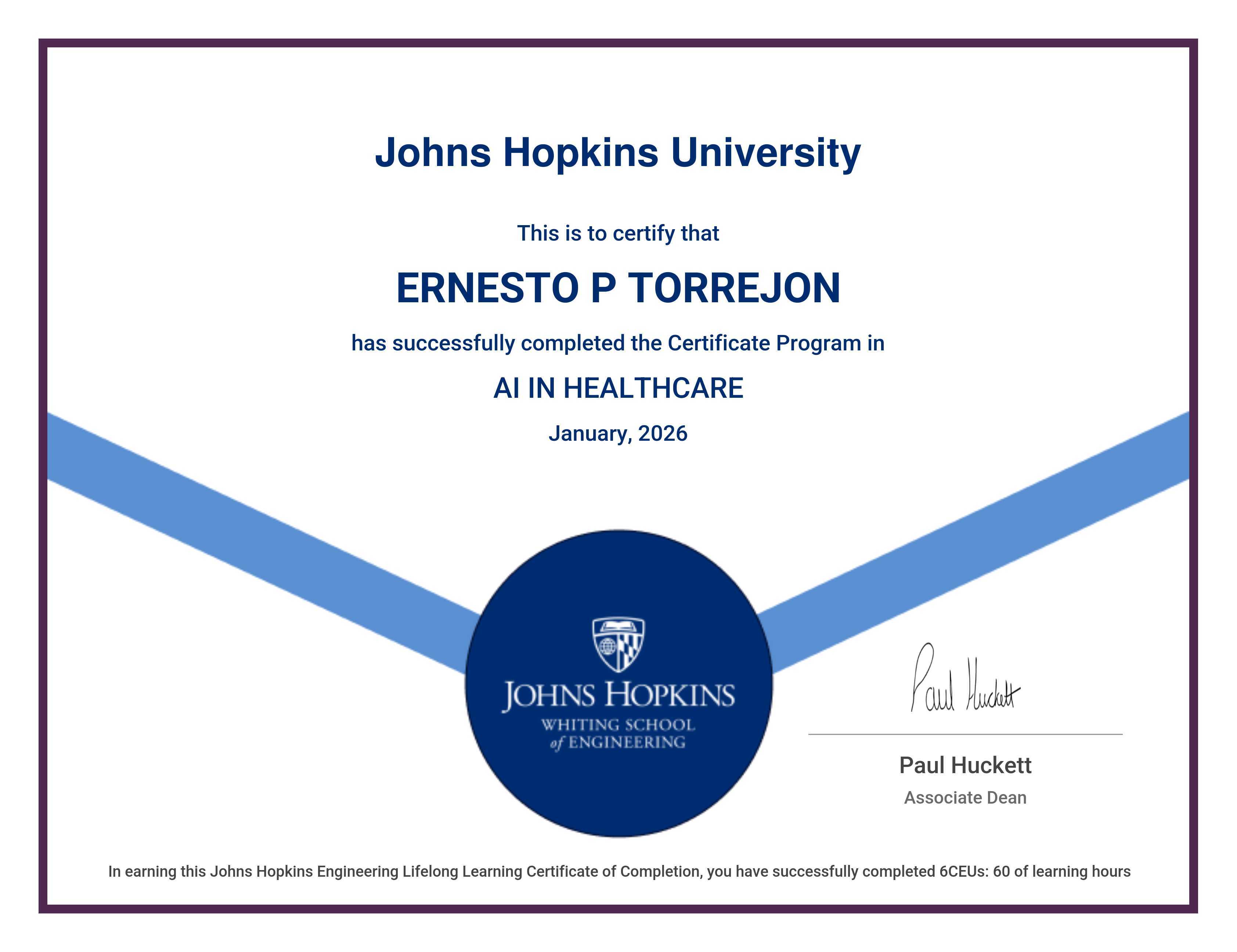 The certificate below verifies that ERNESTO P TORREJON has completed the AI IN HEALTHCARE