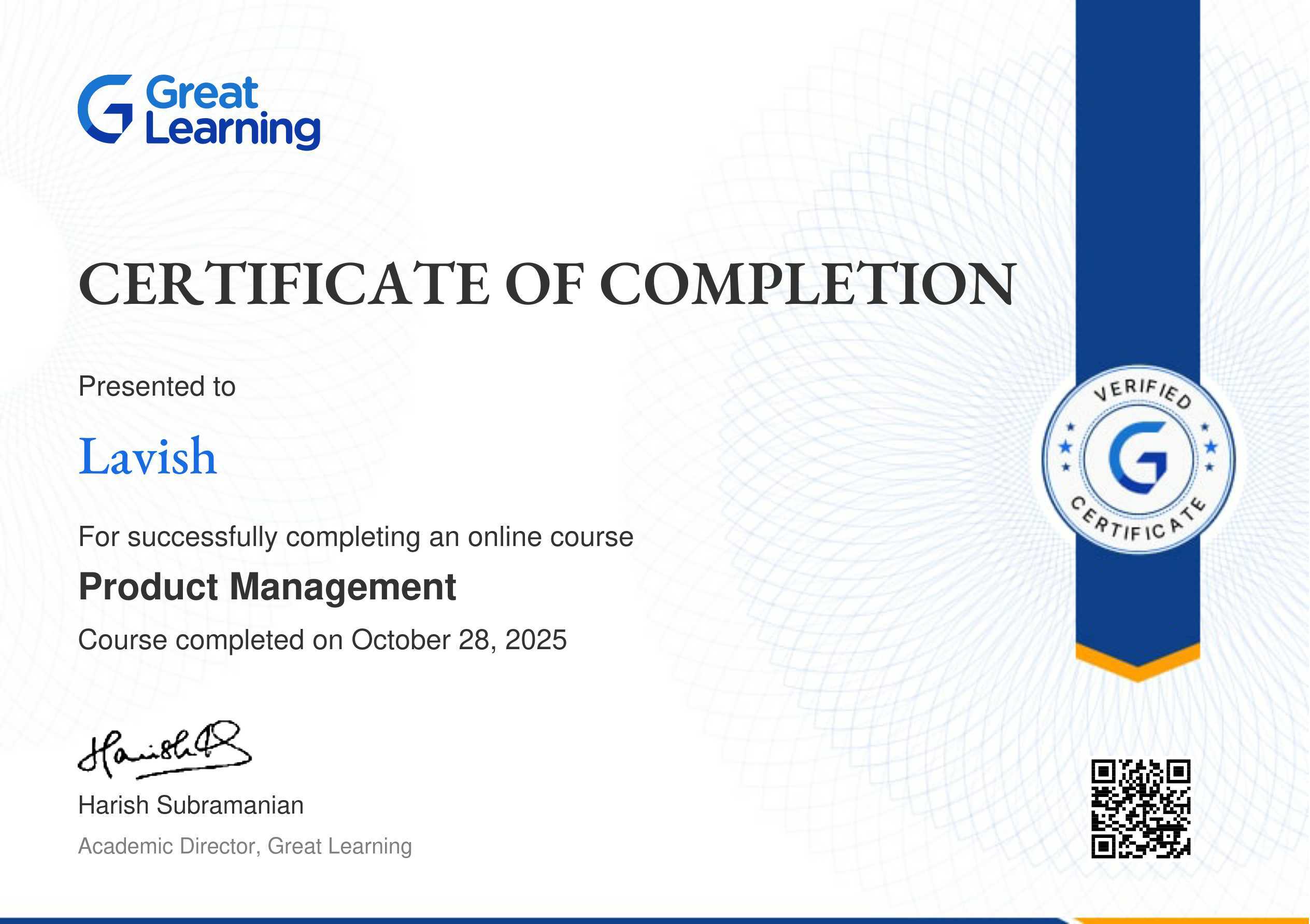 The certificate above verifies that Lavish has successfully completed the course Product Management