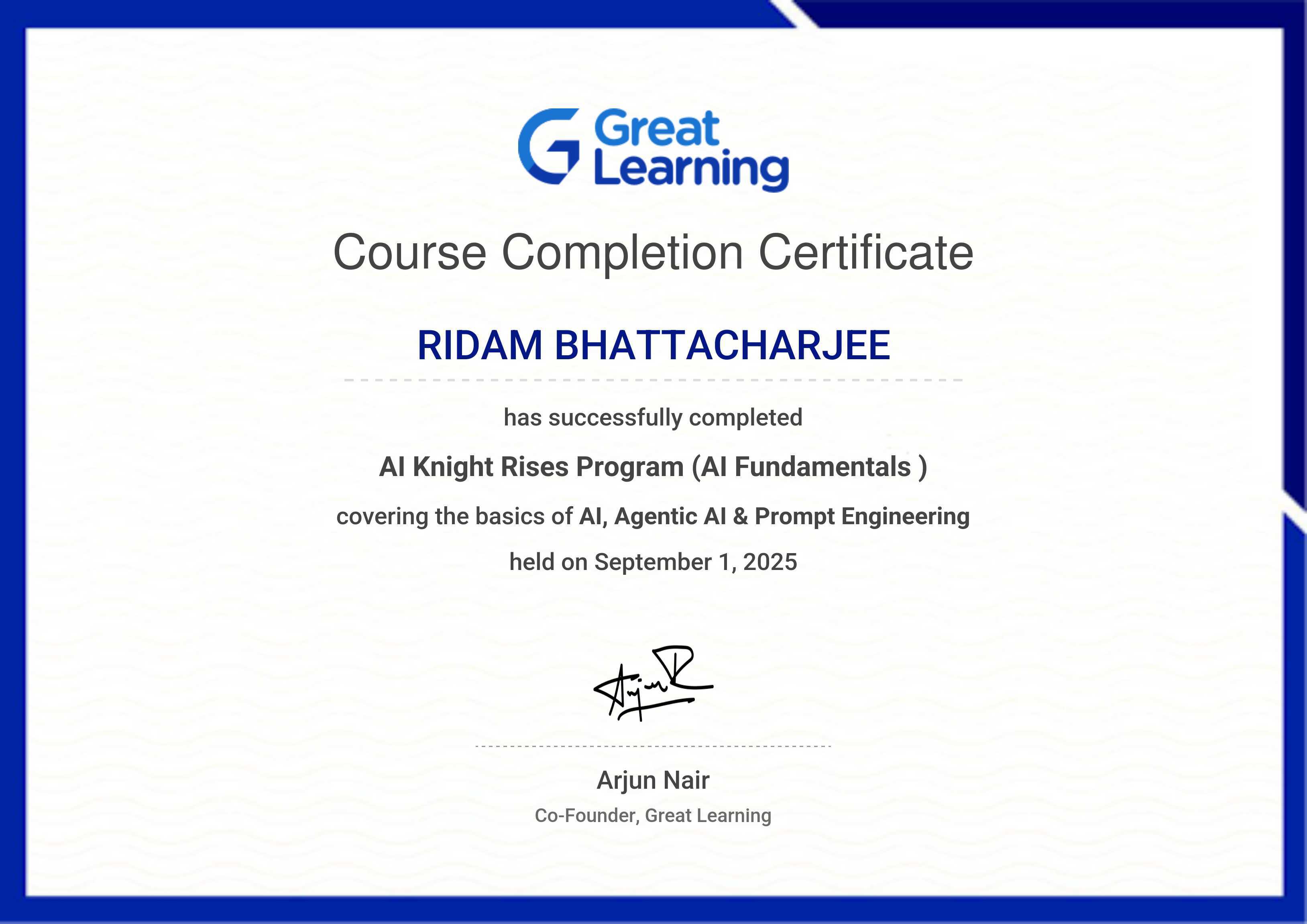 The certificate below verifies that RIDAM BHATTACHARJEE has completed the AI Knight Rises Program (AI Fundamentals )