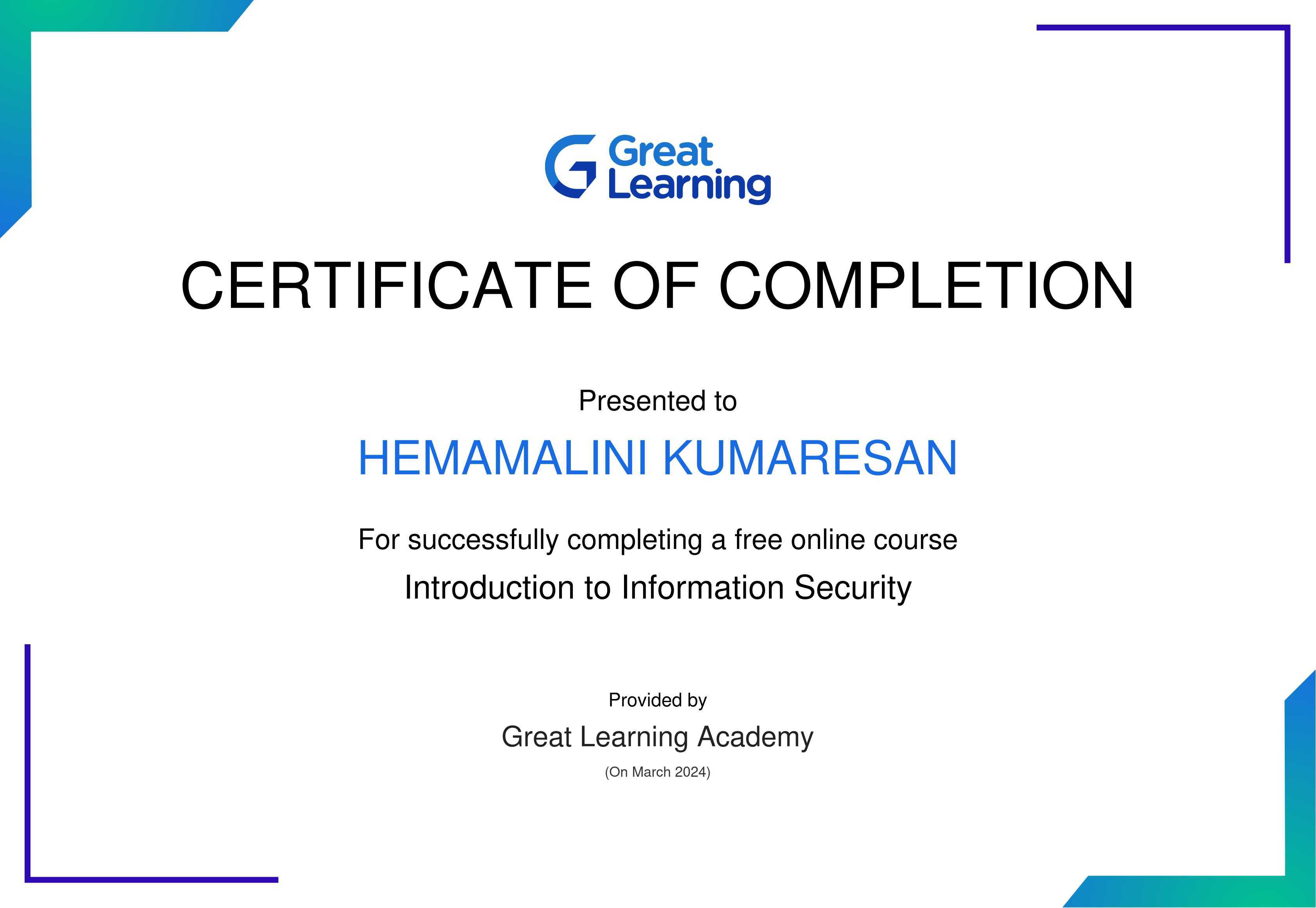The certificate above verifies that Hemamalini Kumaresan has successfully completed the course Introduction to Information Security