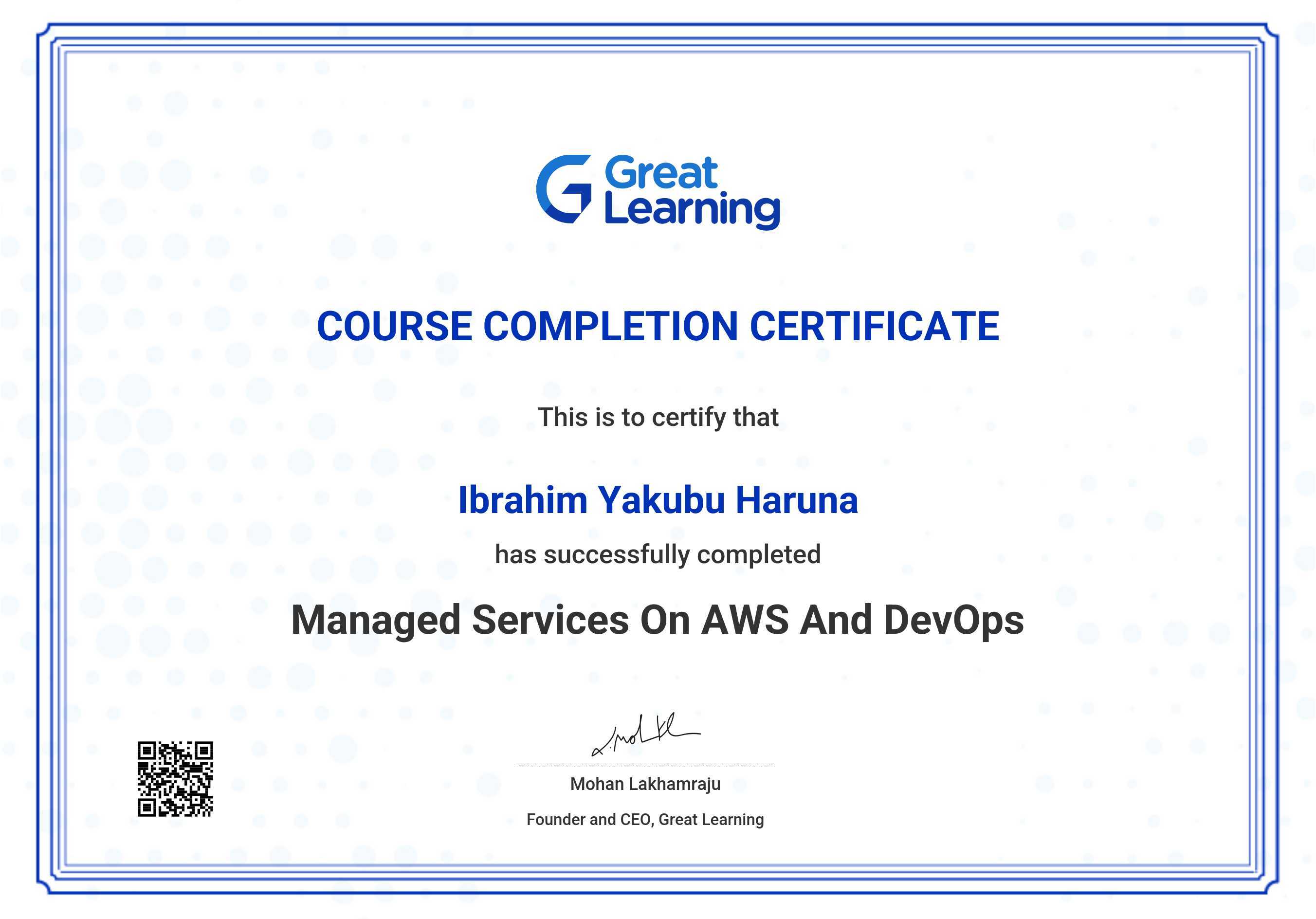 The certificate below verifies that Ibrahim Yakubu Haruna has completed the Managed Services on AWS and DevOps course
