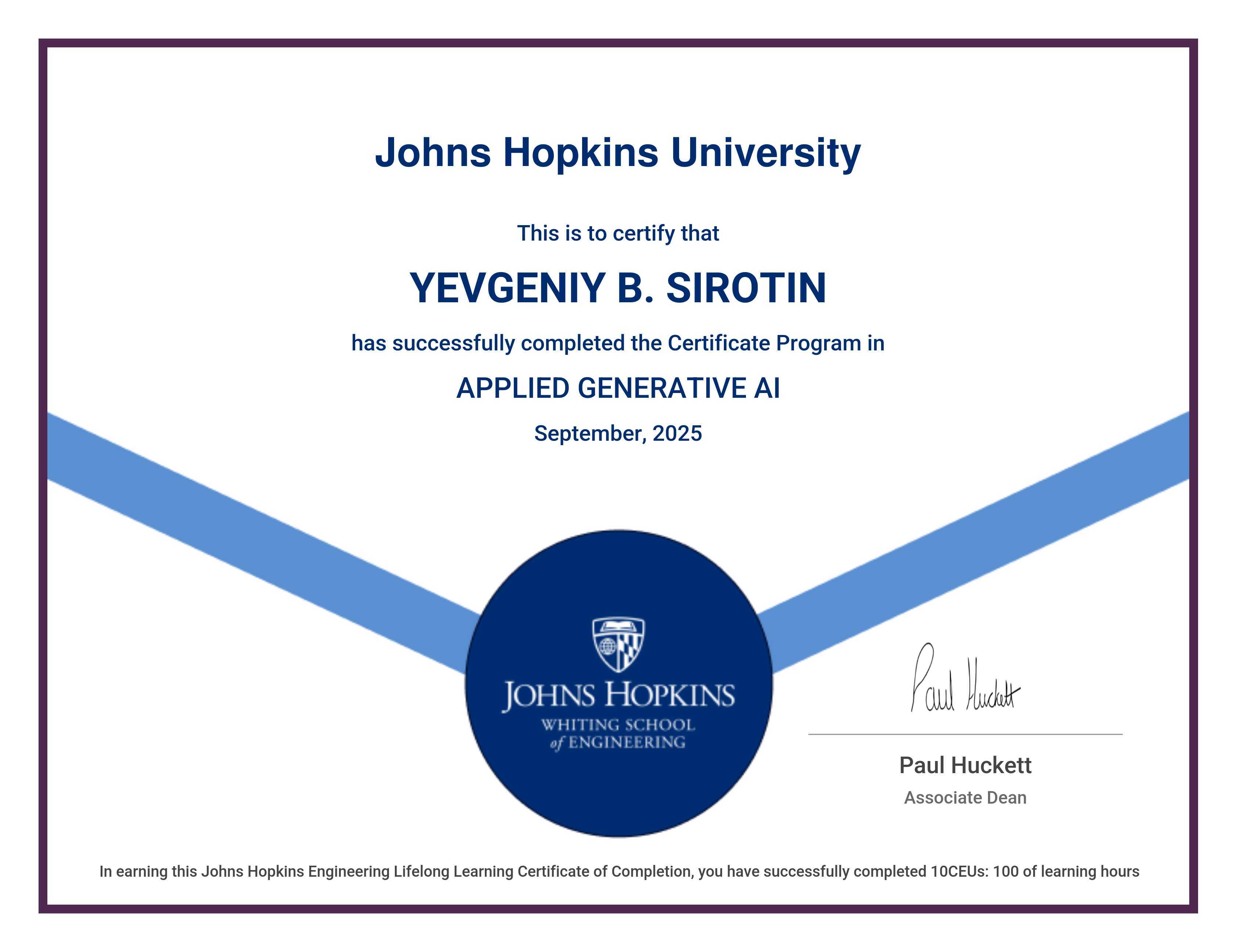 The certificate below verifies that YEVGENIY B. SIROTIN has completed the APPLIED GENERATIVE AI