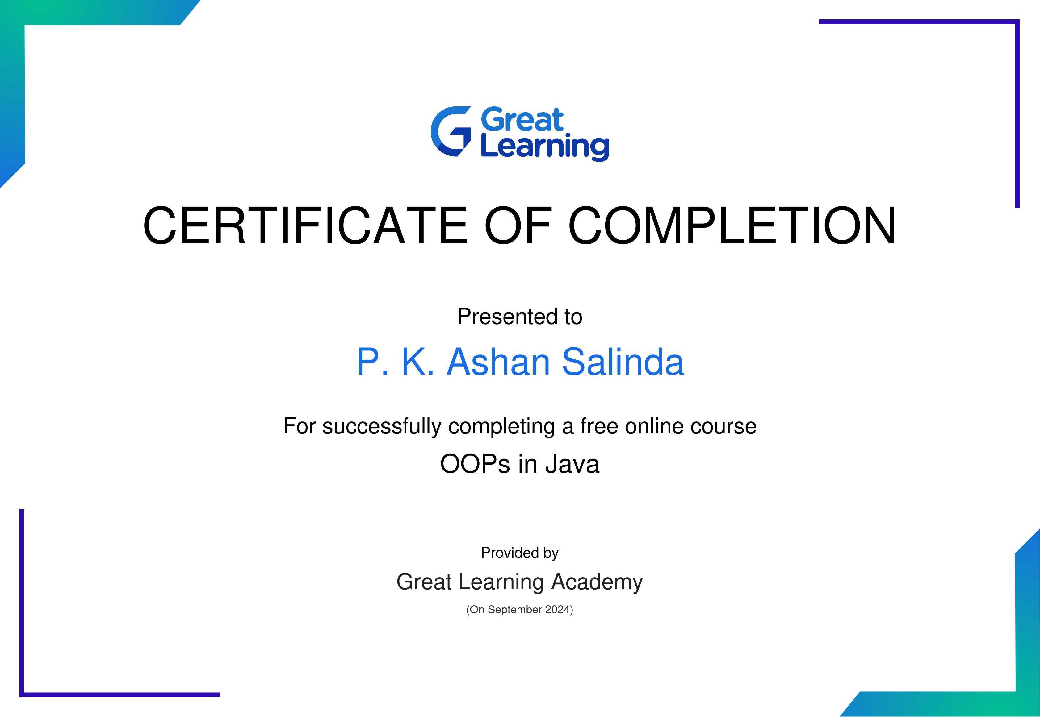 The certificate above verifies that P. K. Ashan Salinda has successfully completed the course OOPs in Java