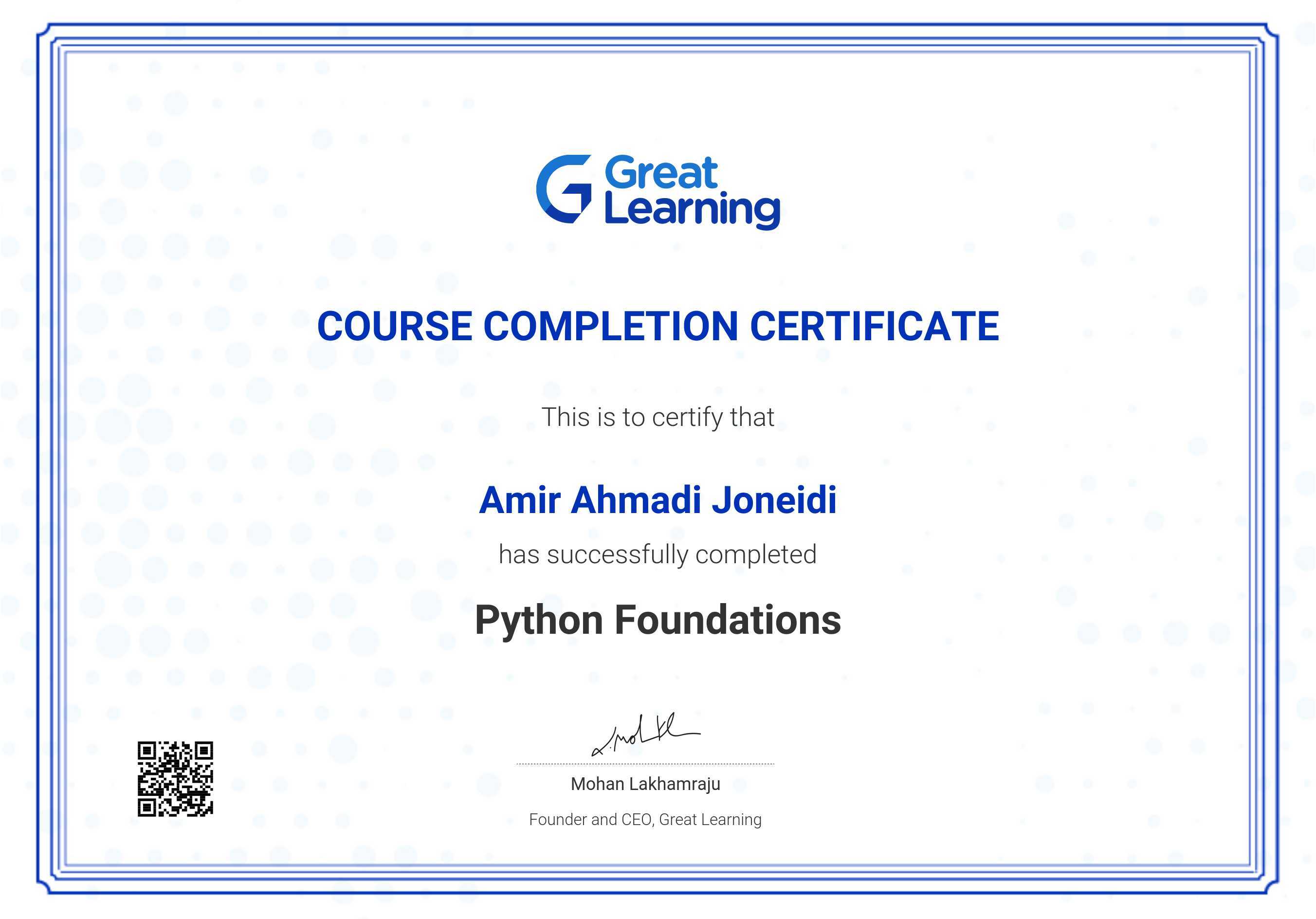 The certificate below verifies that Amir Ahmadi Joneidi has completed the Python Foundations course