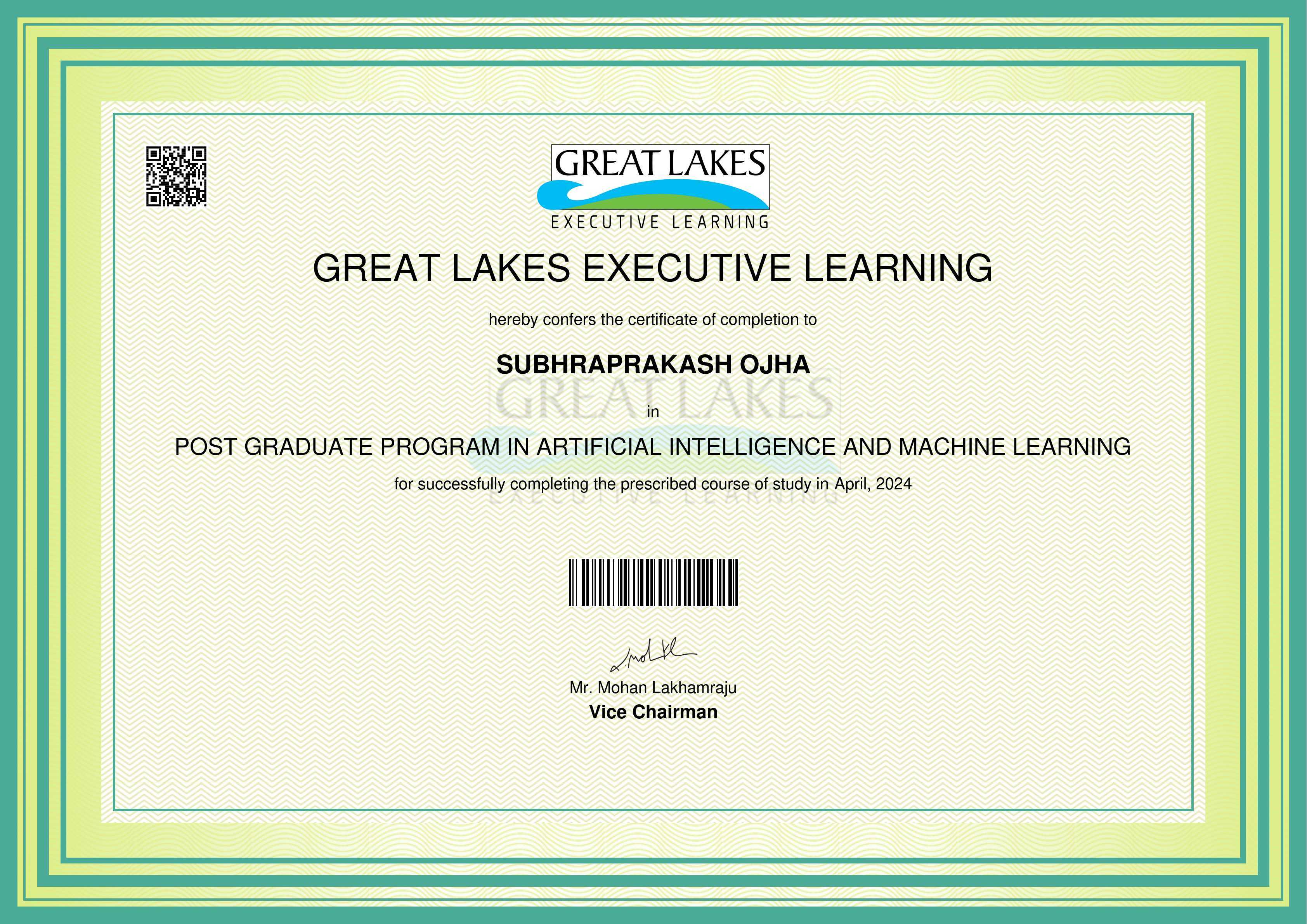 The certificate below verifies that SUBHRAPRAKASH OJHA has completed the POST GRADUATE PROGRAM IN ARTIFICIAL INTELLIGENCE AND MACHINE LEARNING