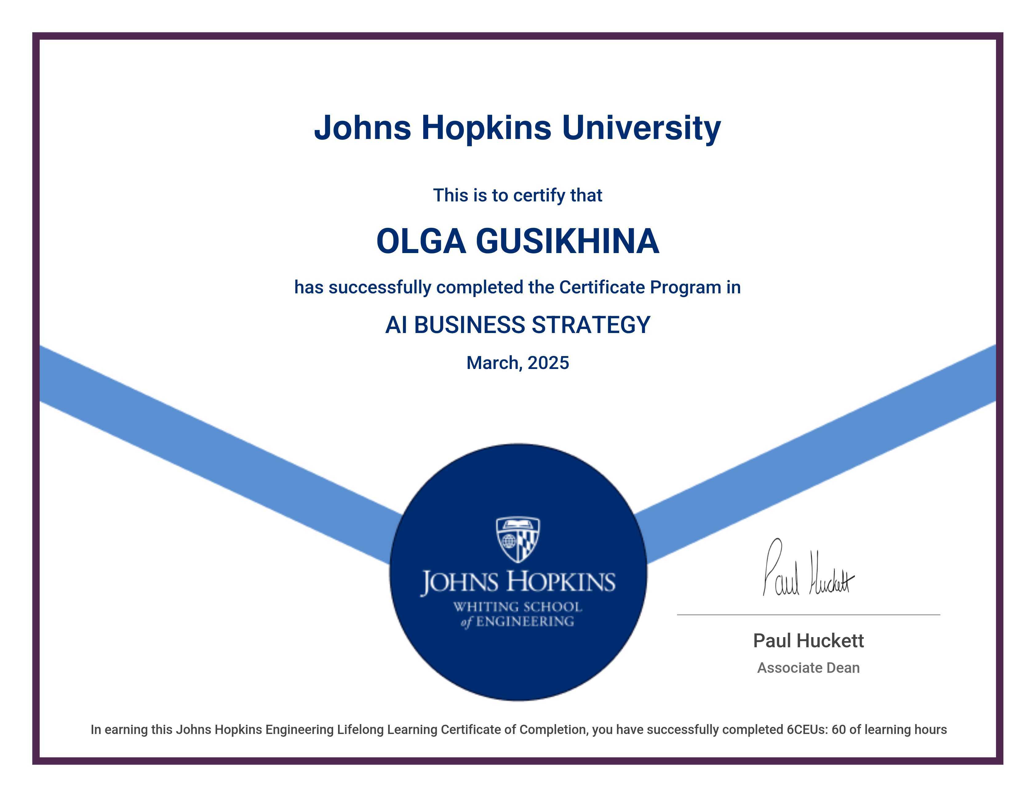 The certificate below verifies that OLGA GUSIKHINA has completed the AI BUSINESS STRATEGY