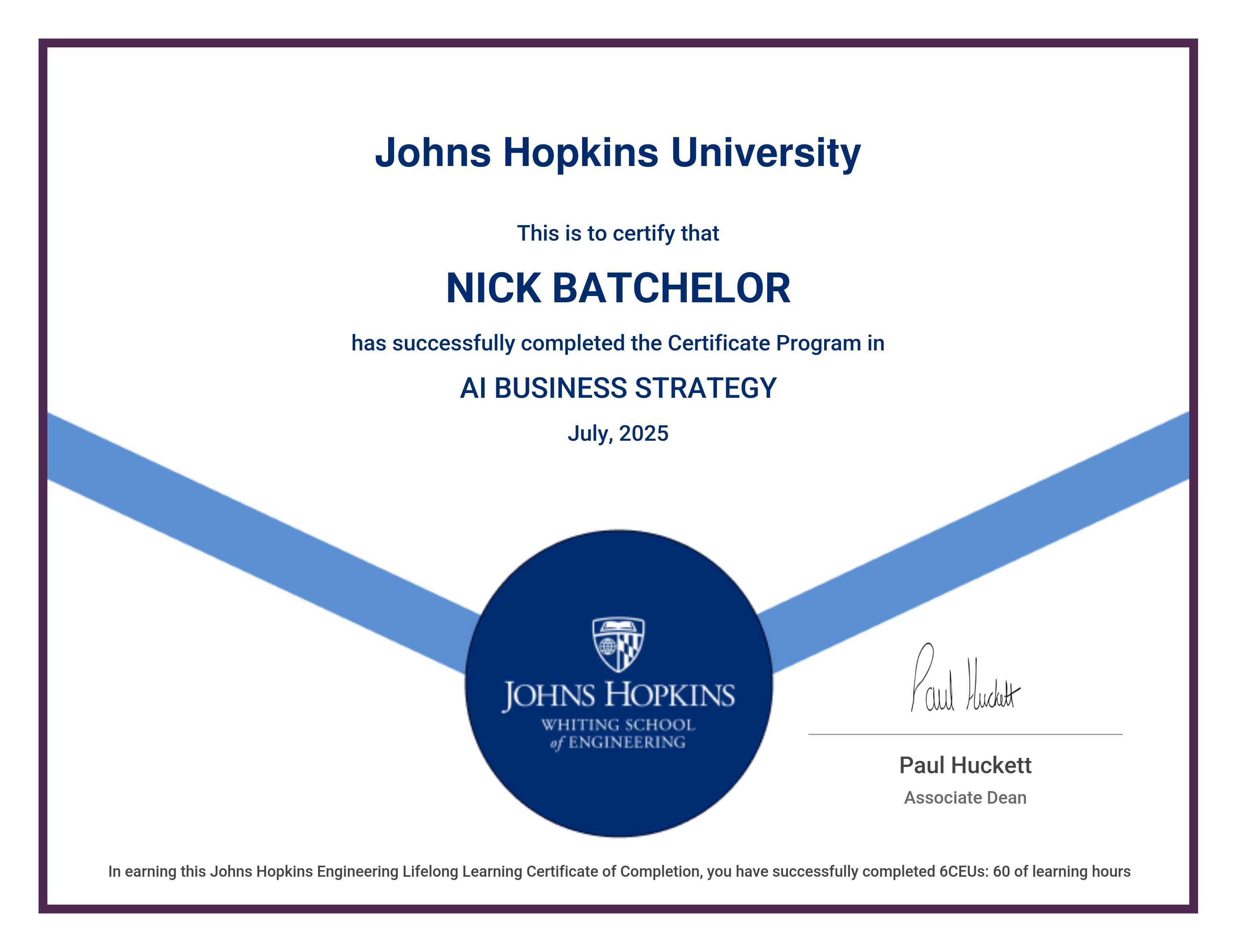 The certificate below verifies that NICK BATCHELOR has completed the AI BUSINESS STRATEGY