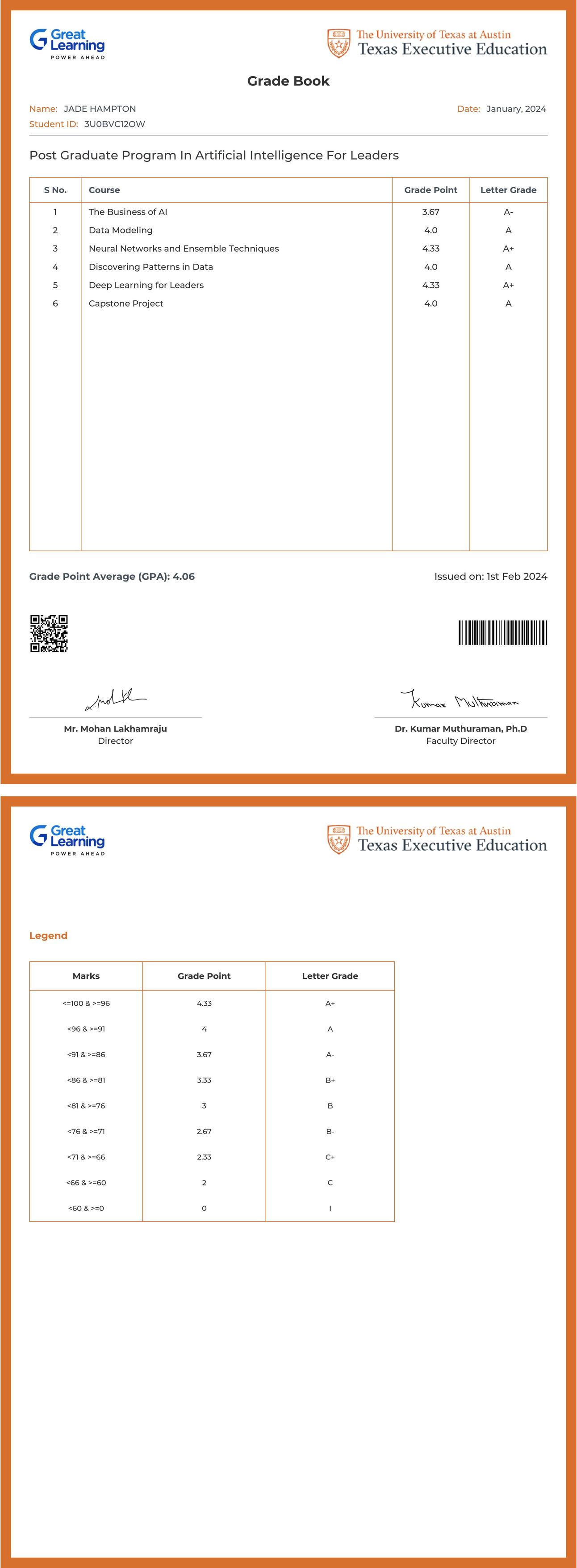 The grade sheet below verifies that JADE HAMPTON has completed the POST GRADUATE PROGRAM IN ARTIFICIAL INTELLIGENCE FOR LEADERS