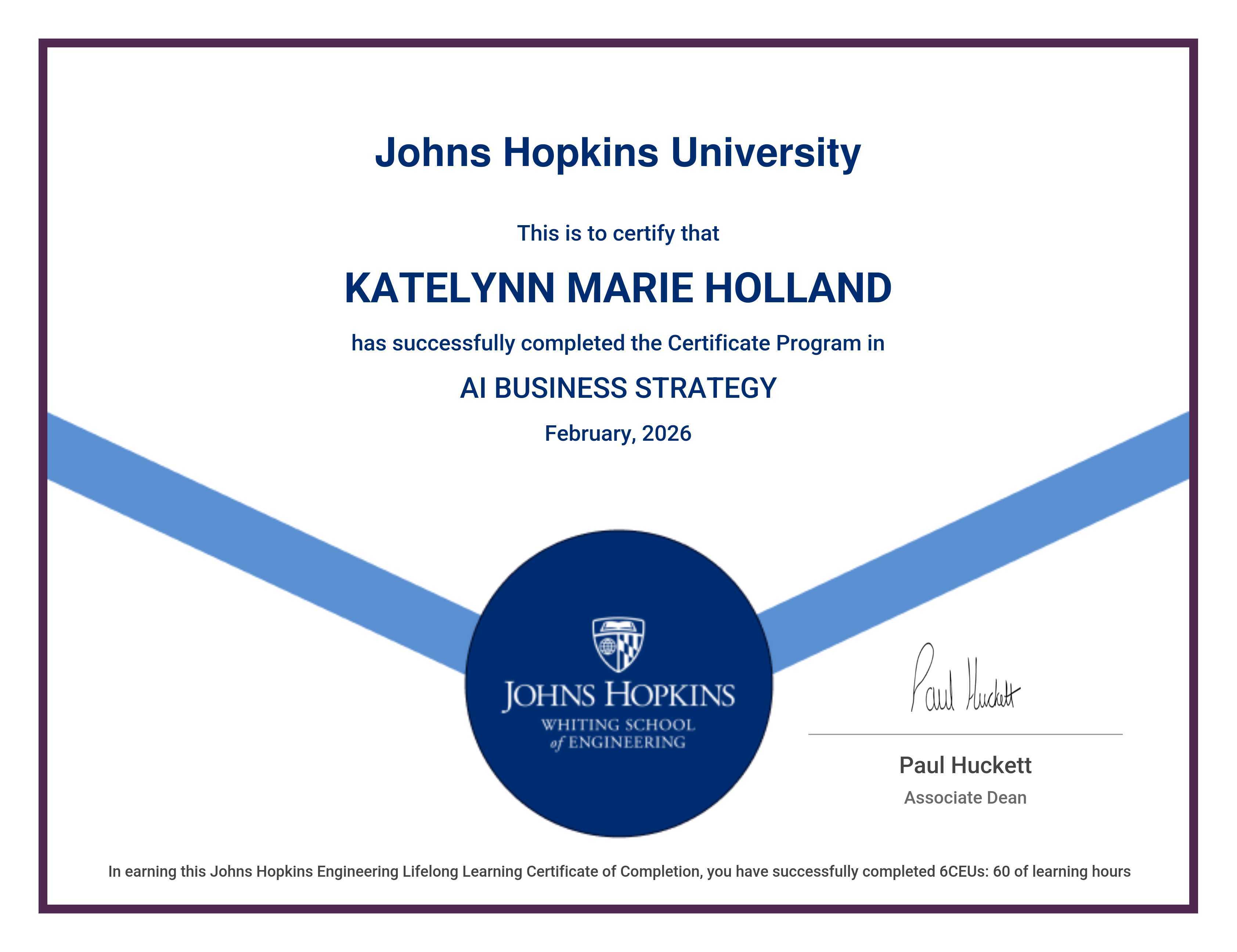 The certificate below verifies that KATELYNN MARIE HOLLAND has completed the AI BUSINESS STRATEGY
