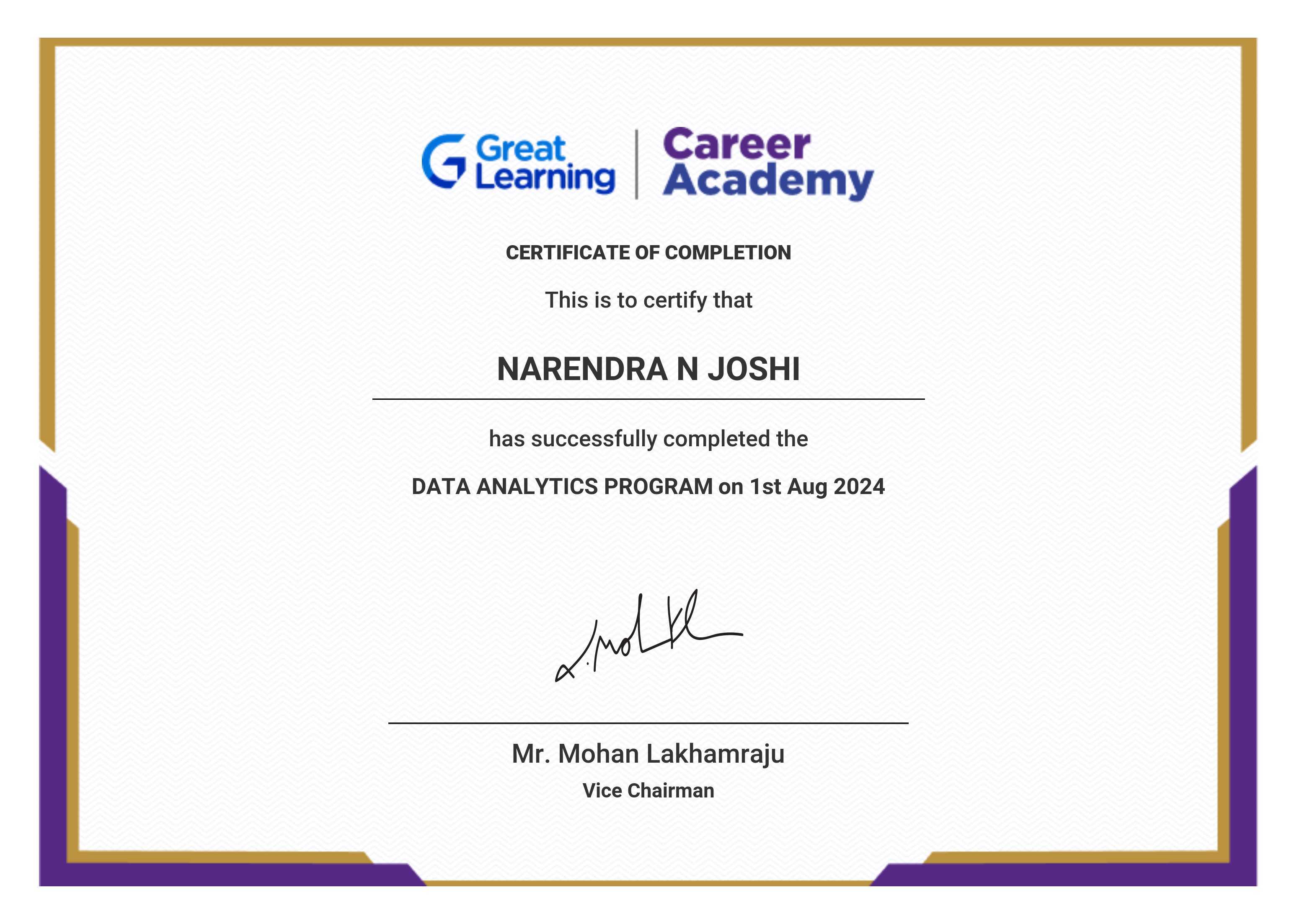 The certificate below verifies that NARENDRA N JOSHI has completed the DATA ANALYTICS PROGRAM