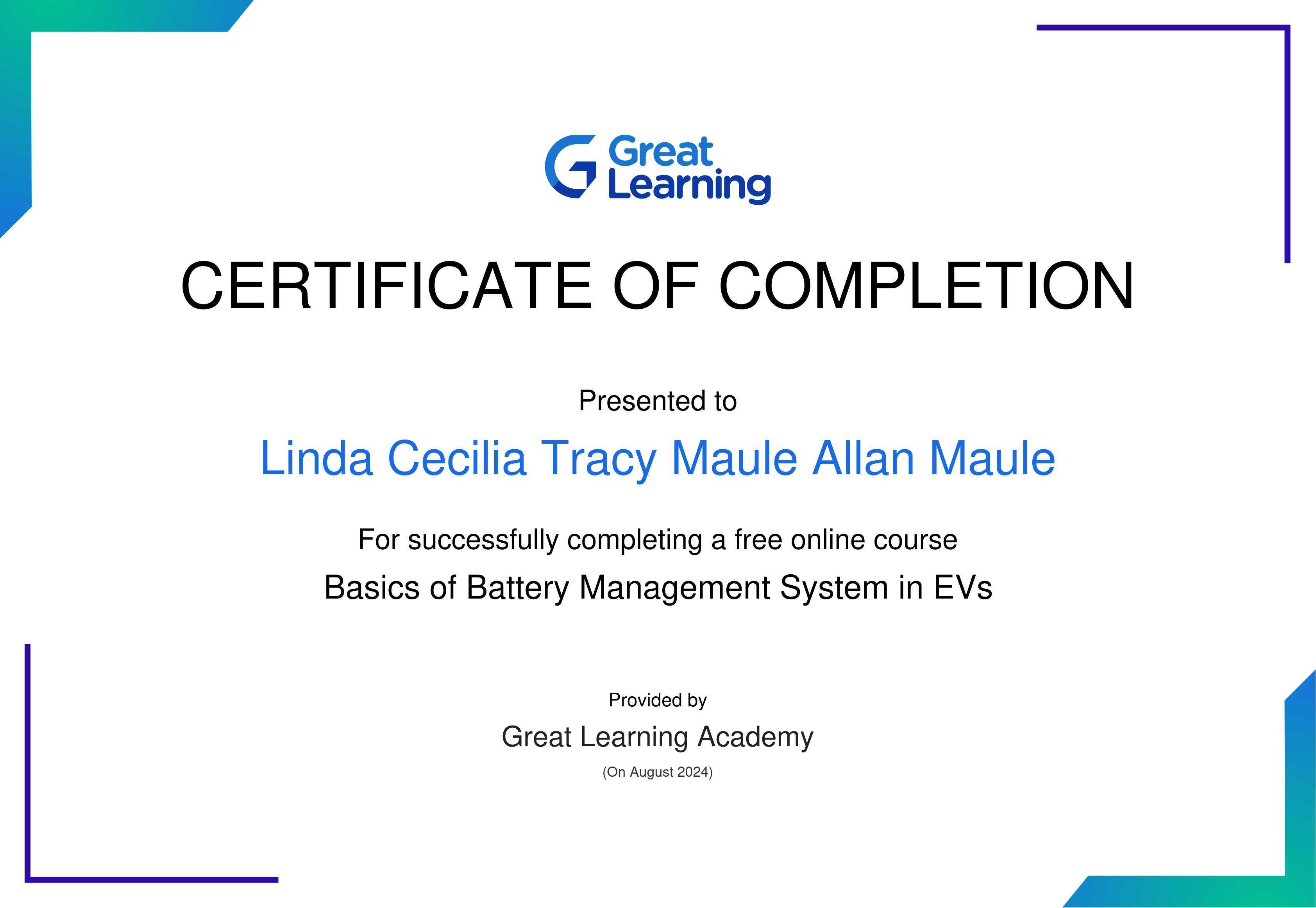 The certificate above verifies that Linda Cecilia Tracy Maule Allan Maule has successfully completed the course Basics of Battery Management System in EVs
