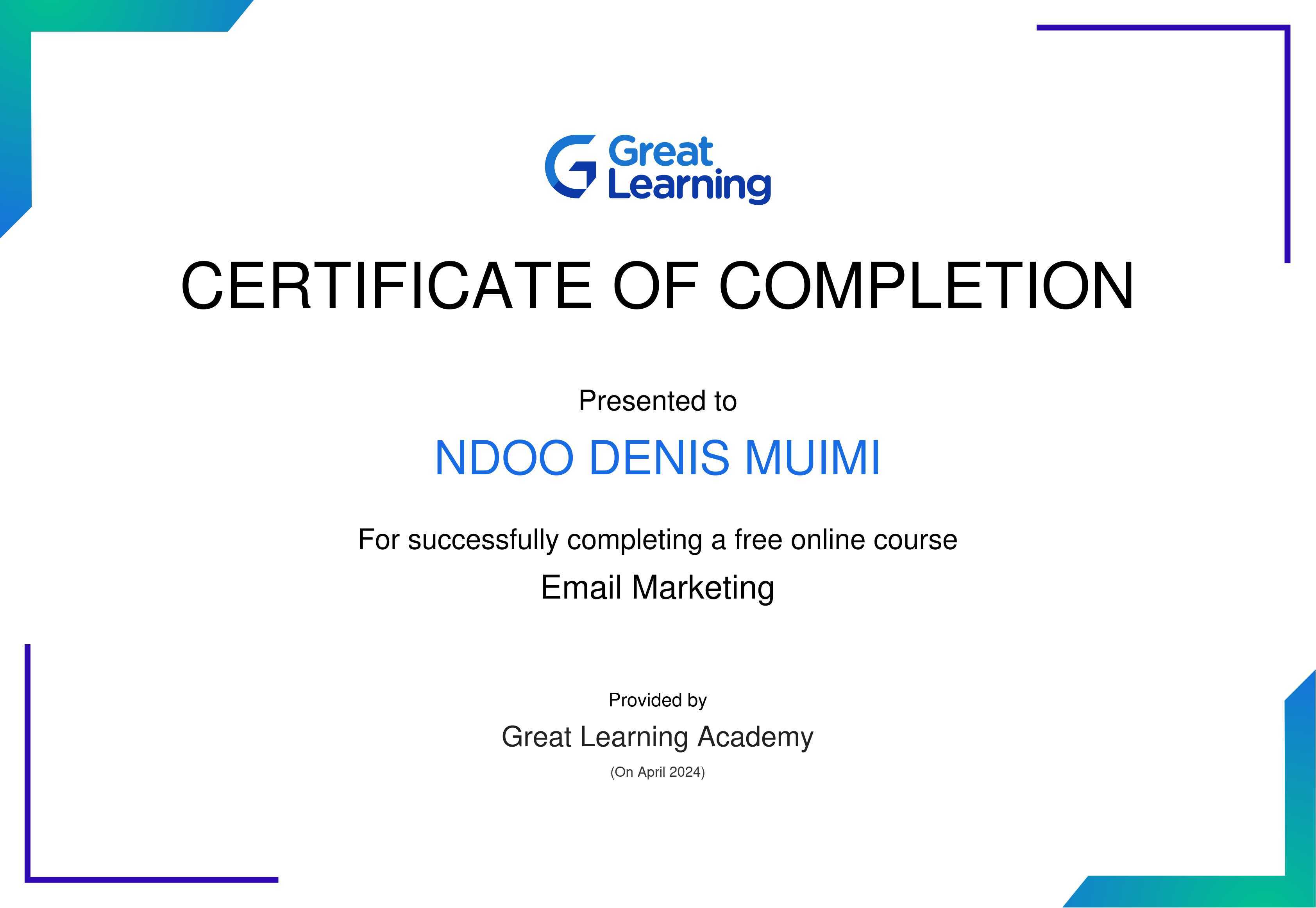 The certificate above verifies that Ndoo Denis Muimi has successfully completed the course Email Marketing