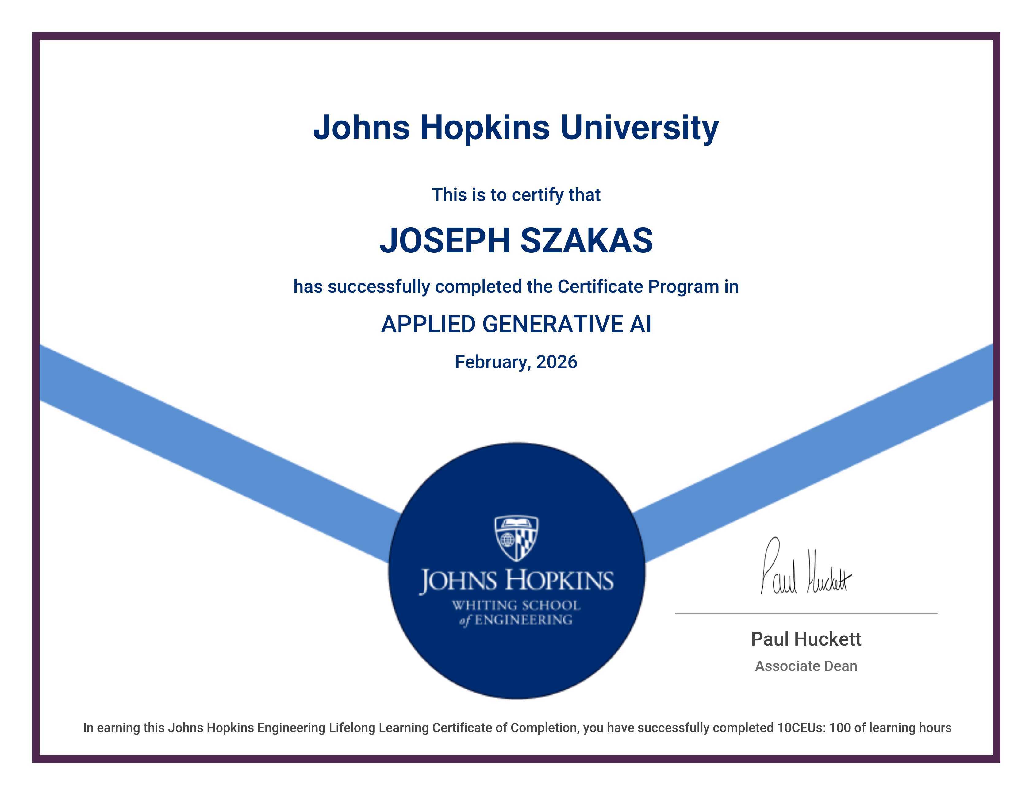 The certificate below verifies that JOSEPH SZAKAS has completed the APPLIED GENERATIVE AI