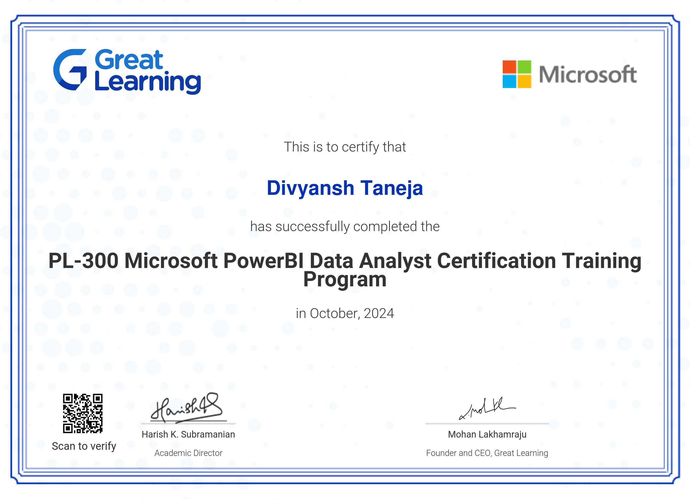 The certificate below verifies that DIVYANSH TANEJA has completed the PL-300 MICROSOFT PowerBI DATA ANALYST CERTIFICATION TRAINING PROGRAM