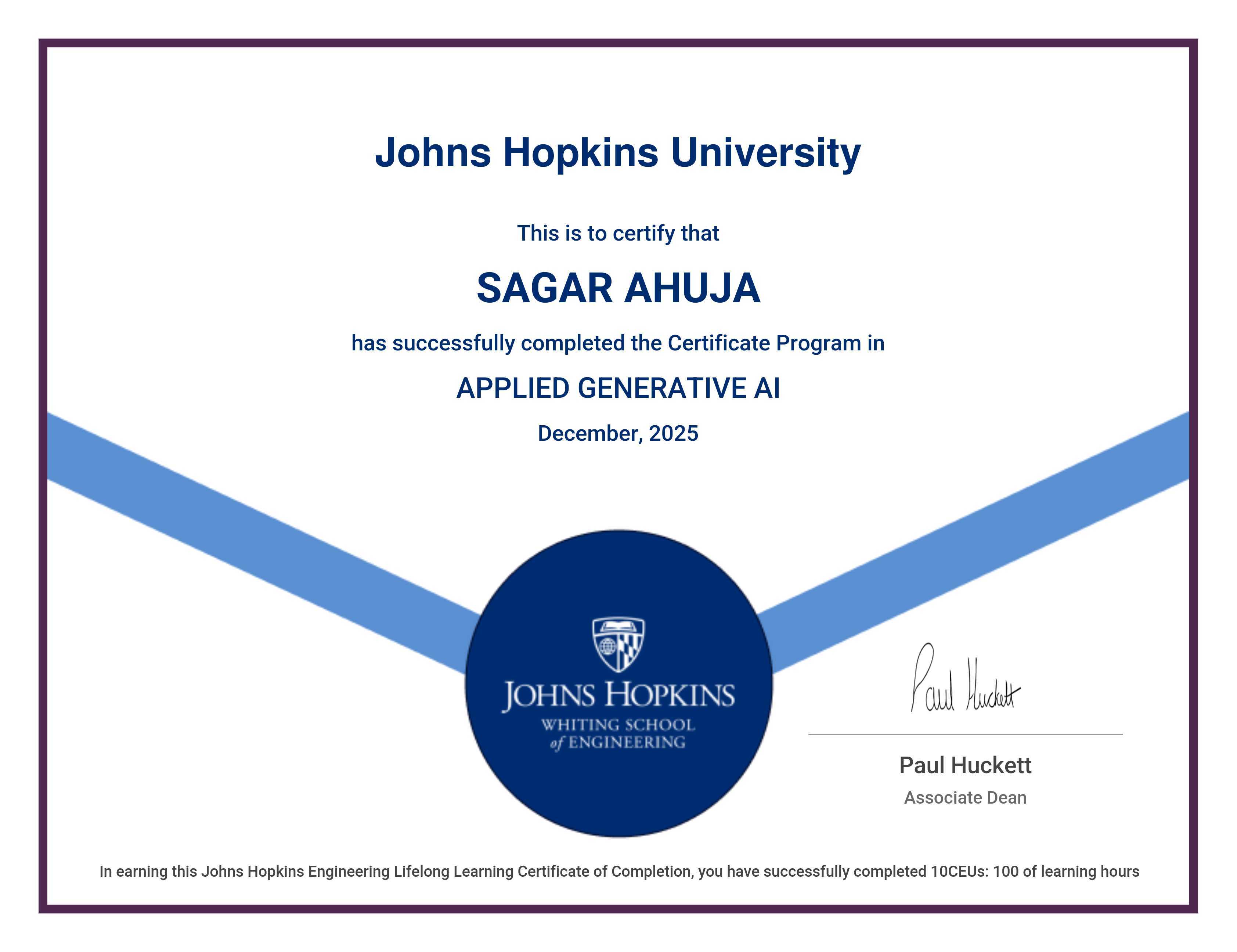 The certificate below verifies that SAGAR AHUJA has completed the APPLIED GENERATIVE AI